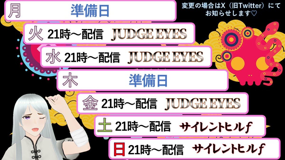 ウェーイッ!マクラの直近の配信スケジュールでーす🗓️明日からは『ジャッジアイズ』をスタートさせるので、ぜひ観に来てちょ!アサマクラチャンネル↓ youtube.com/channel/UCnOt3… #vtuber #新人 #アサマクラカエシ pic.x.com/Llird2srDr