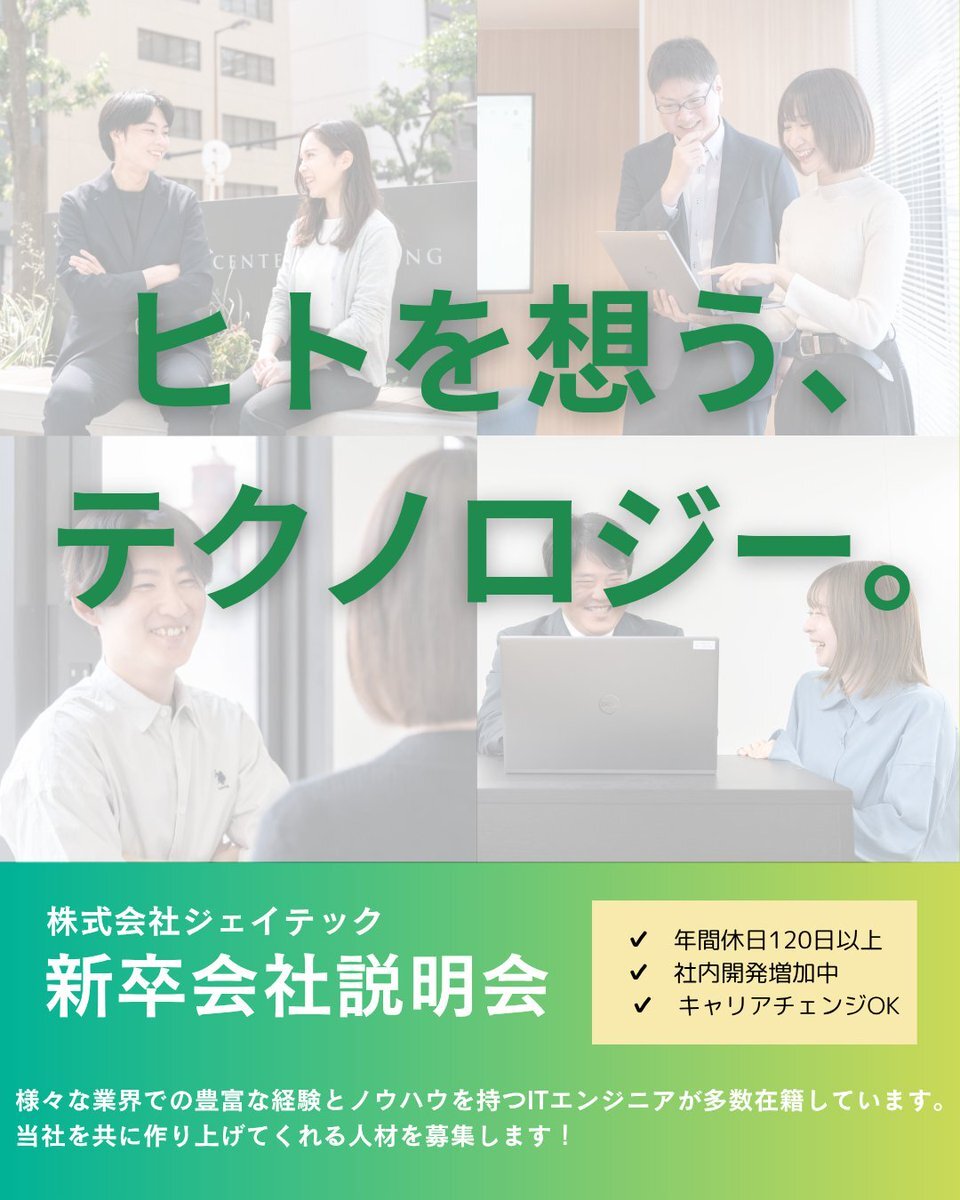 📢2027年卒!新卒向け会社説明会がスタートしました!⭐️ 仕事内容だけでなく、働く環境や仲間たちの事など何でもお話します😊 オンラインで行いますのでお気軽にご参加ください♪ 採用サイト⬇️ j-tech.jp/recruit/ #新卒採用 #27卒 #会社説明会 #IT企業 #東京 #神奈川 #エンジニアと繋がりたい