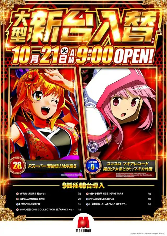 本日!10月20日 #新台入替 💖 🎀─────────────🎀 💚#マギアレコード 新登場!!🧡 💙オリパサで #コネクト しよっ💜 🎀─────────────🎀  🌟その他機種は画像をcheck🌟 抽選開始は9時50分🎵 開店時間は10時です😆😆❣️ #パチンコ #スロット #スマパチ #スマスロ pic.x.com/WQboahNABu