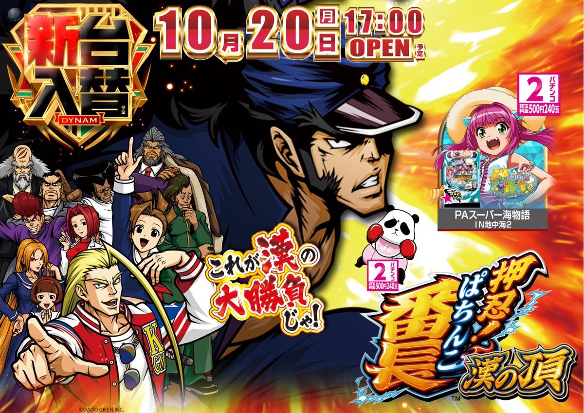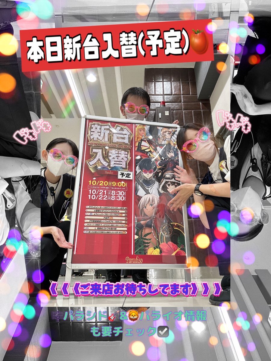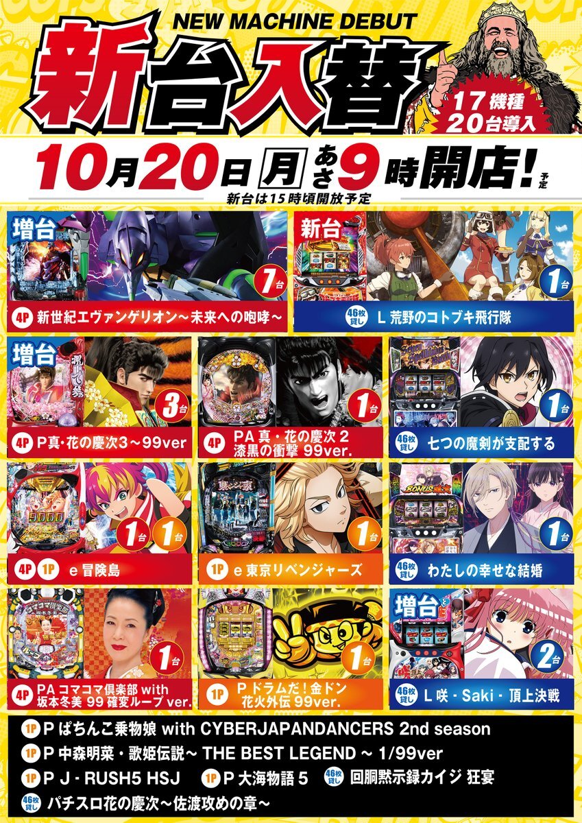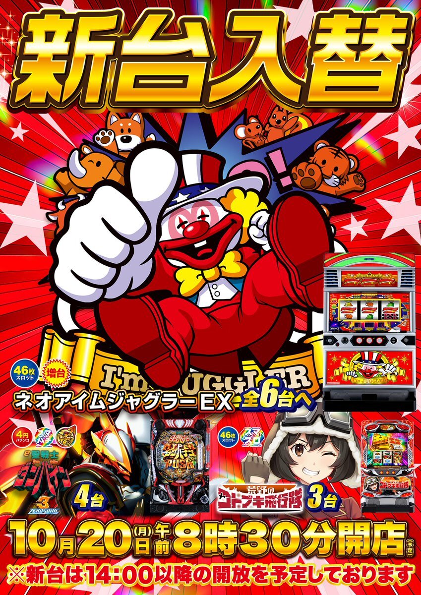 10月20日 🆕新台入替🆕 新台は全台17時開放予定やで🔥 新台ご希望の方は16:50に カウンター前にて抽選‼️‼️‼️ すなわち…入替作業で筋肉痛💪 まだまだ若いもんには⁉️ 負けられんからなぁー👴←老害 #新台入替 #1Pにも新台登場 pic.x.com/urCs70XLG5