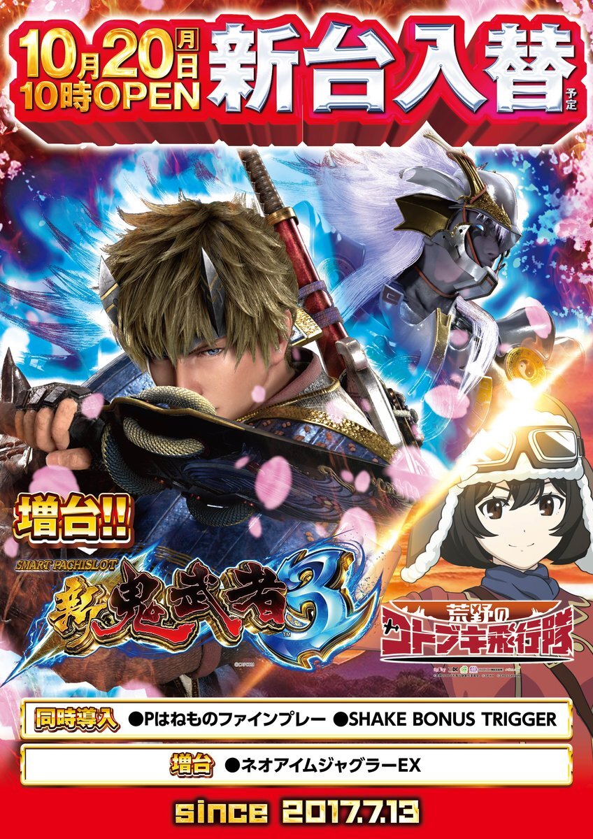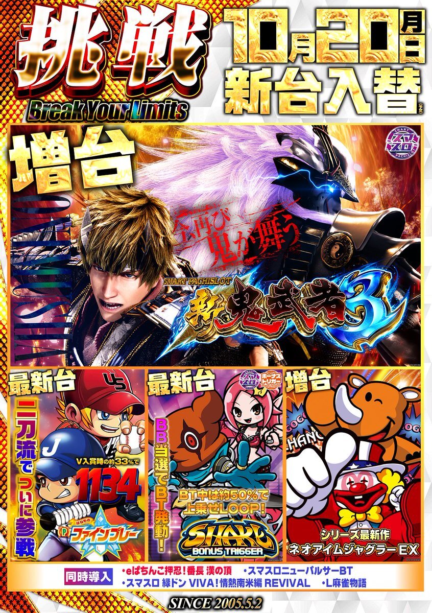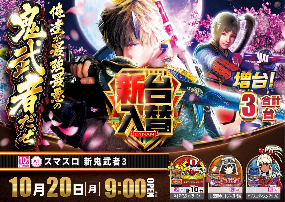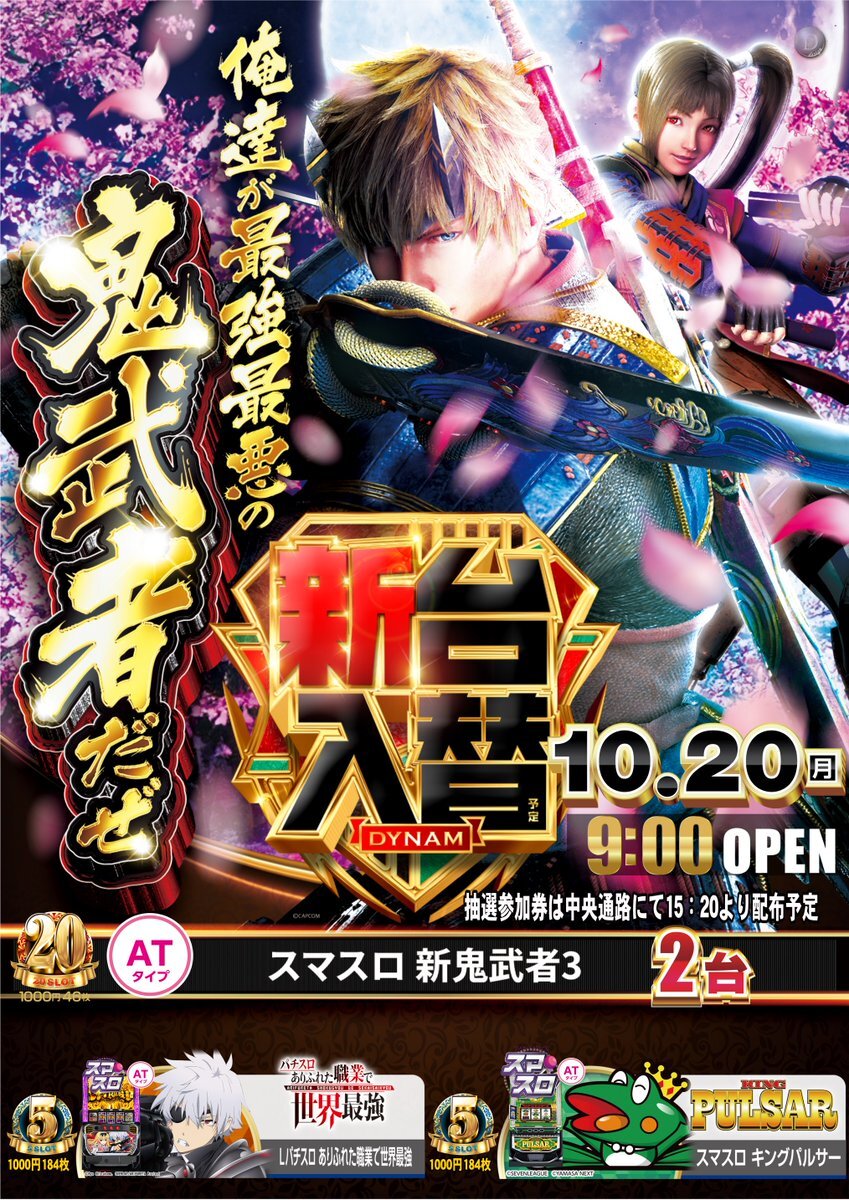 こんにちは!! ダイナム新井店です😃 お待たせいたしました!!! 10/20 月曜日は… 👹👹👹👹👹👹👹👹👹👹 👹スマスロ #新鬼武者3 👹 👹👹👹👹👹👹👹👹👹👹 を始めとした話題機を 8機種12台導入致します!! 新台抽選は15:20~となります👹 ご来店お待ちしております👹 #ダイナム #北斗の拳