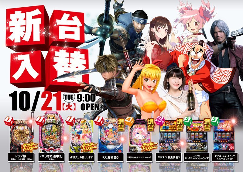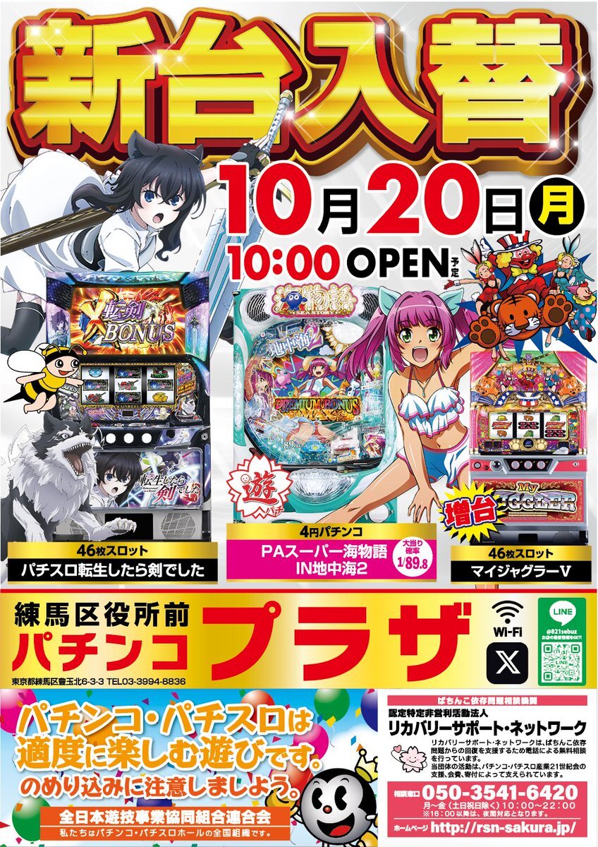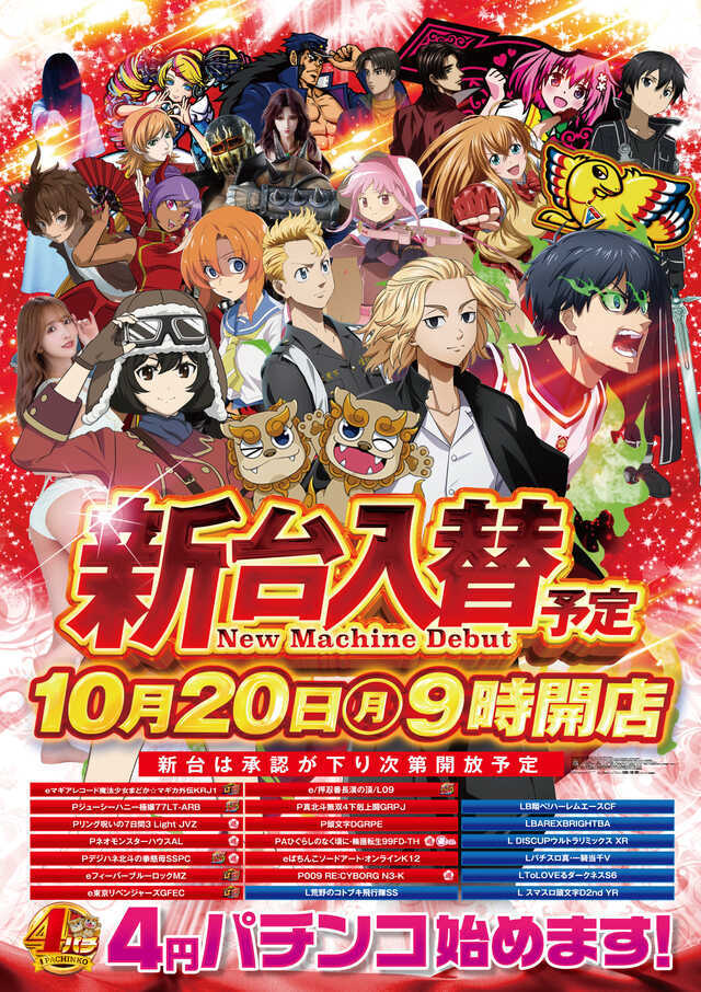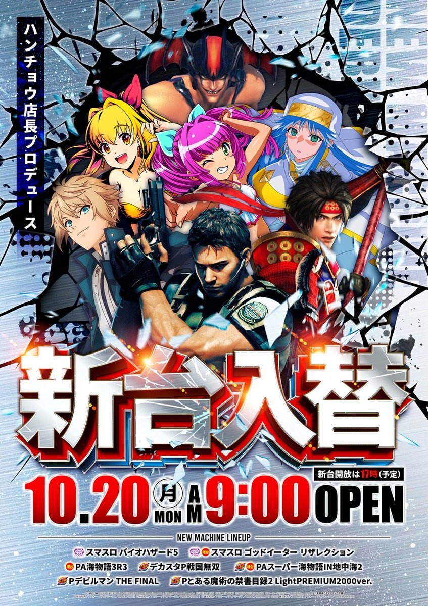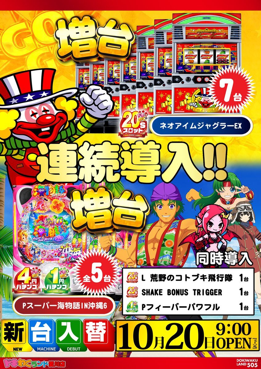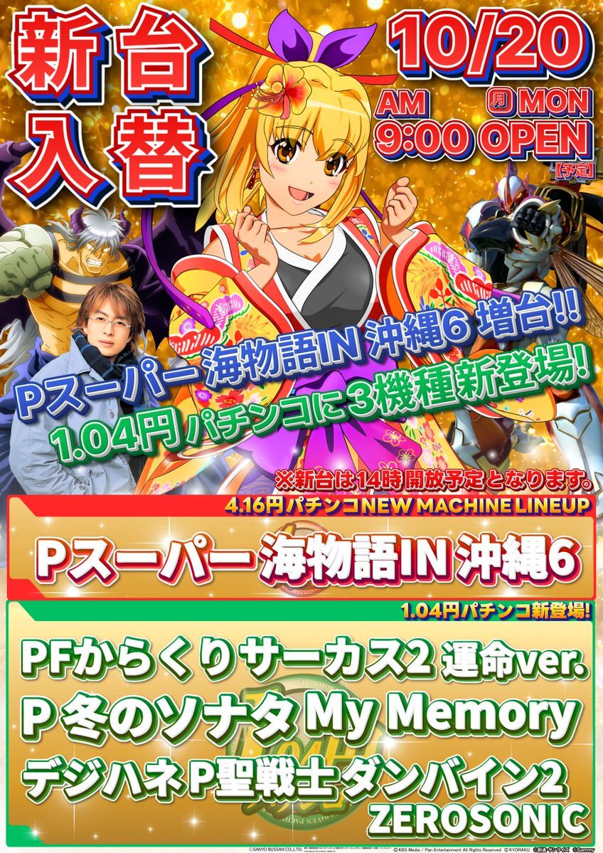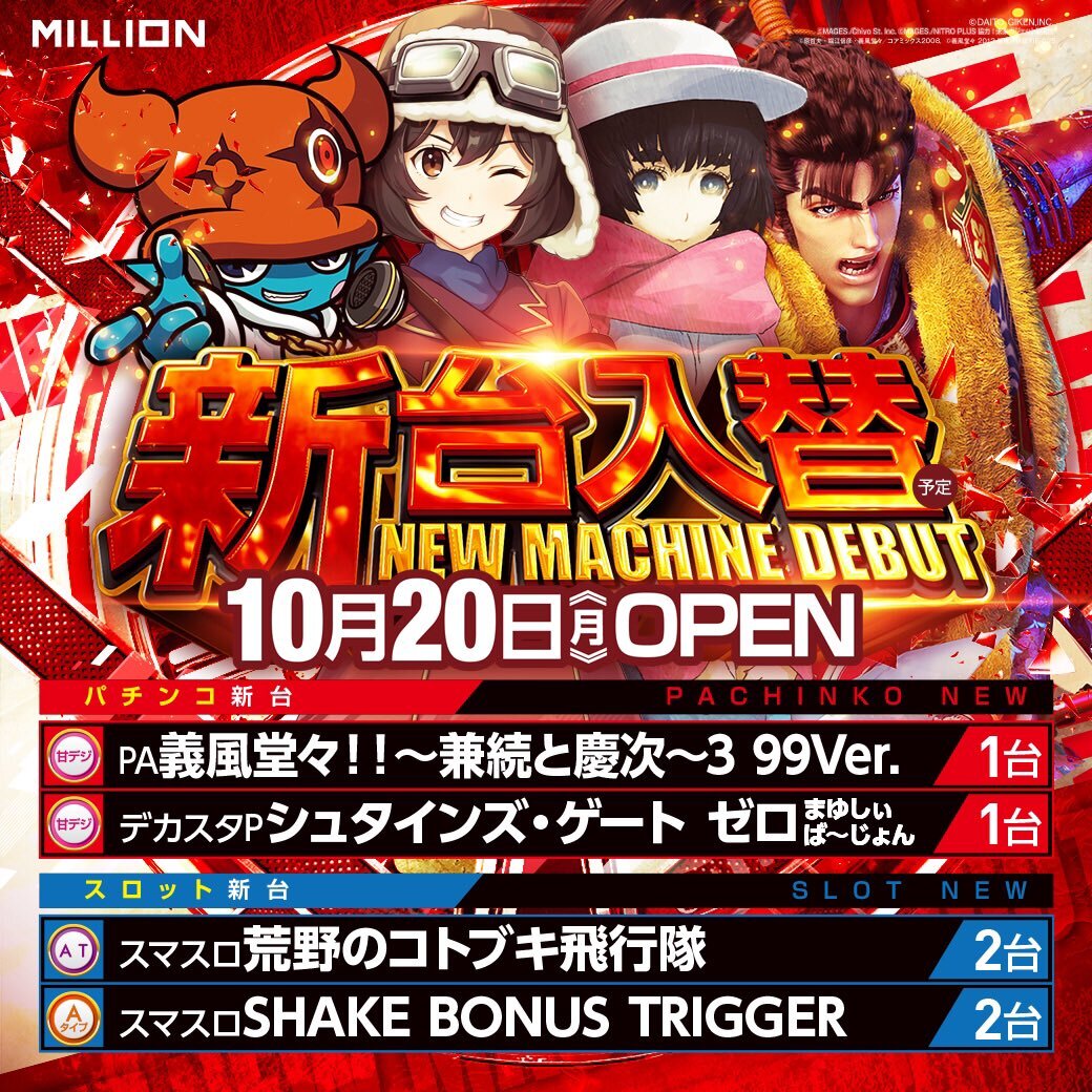10月20日(月) 新台入替!!! 4機種の最新台が登場します! 新台抽選時間は LINE・店内放送にて ご案内致します! #ミリオン中吉野店 #新台入替 pic.x.com/VS85kZaPkm