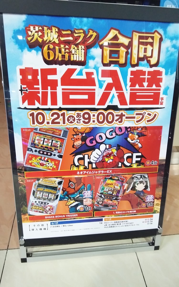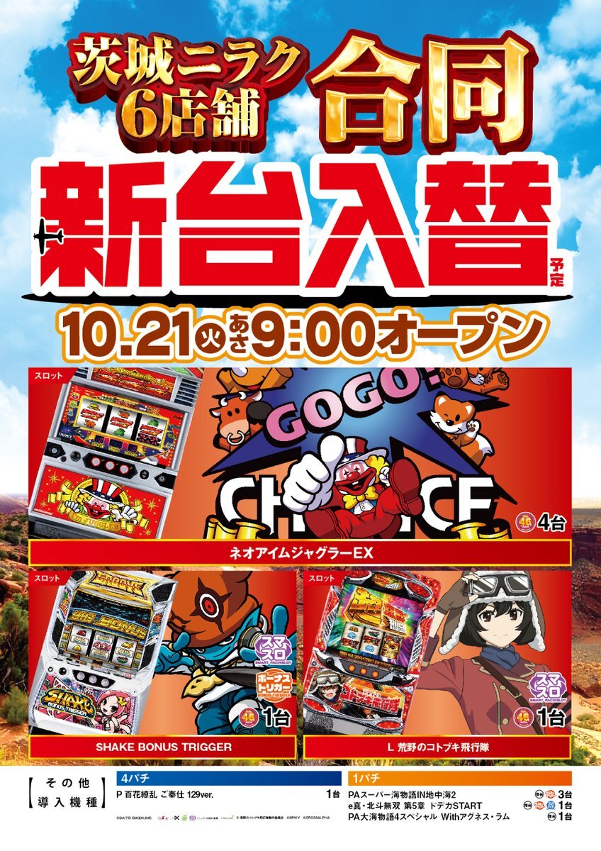 本日は店休日となりますm(__)m 明日1⃣0⃣月2⃣1⃣日(火)は、   茨城ニラク6⃣店舗合同    ✨新台入替✨     朝9⃣時OPEN予定‼ ネオアイムジャグラー導入予定 SHAKE BONUS TRIGGER L 荒野のコトブキ飛行隊 ※その他新台6⃣台 #ニラク下館店 #新台入替 #ネオアイムジャグラー pic.x.com/M2x0dJ1IQv