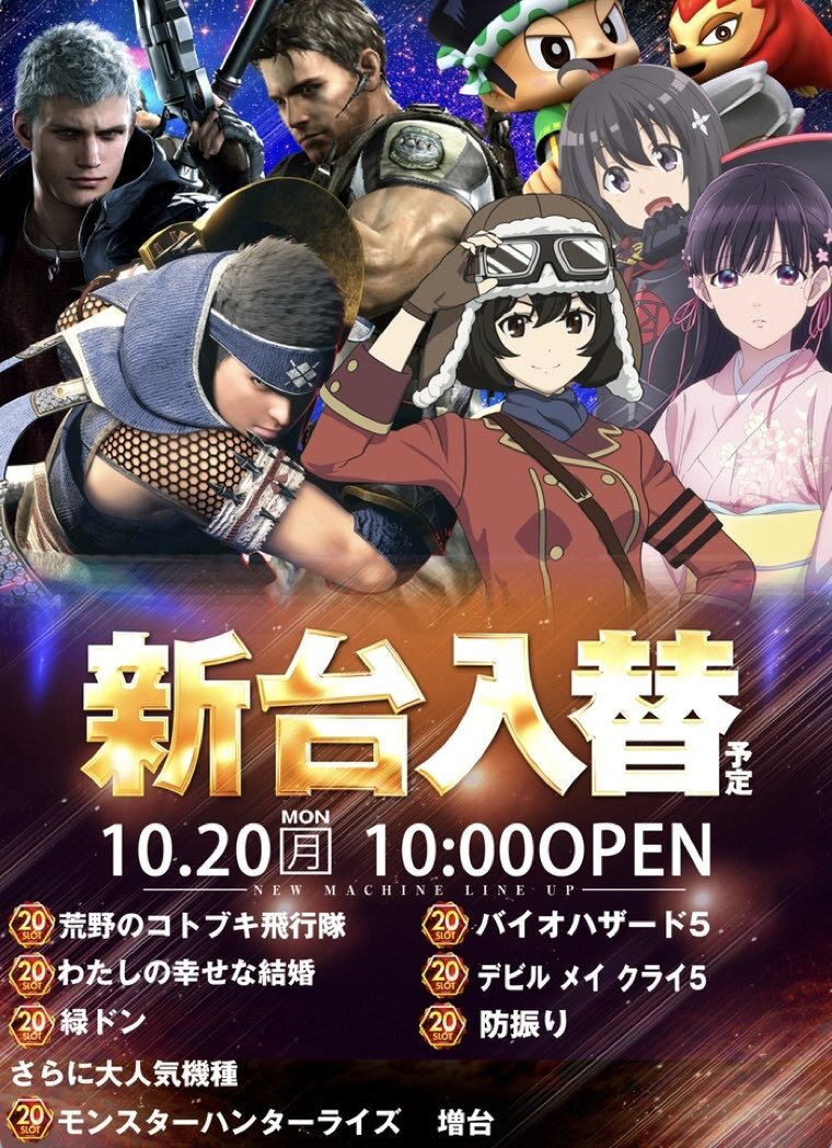 🌹10月20日(月)🌹 ⭐️新台入替⭐️ 🎰20スロ新台機種🎰 🆕荒野のコトブキ飛行隊 🆕バイオ5 🆕デビルメイクライ5 🆕緑ドンVIVA 🆕防振り 🆕わた婚 🆕モンハンライズ(増台) 今週おすすめもお見逃しなく💫 朝イチ抽選▶️【9:50】 #GONE吉祥寺 #新台入替 #リニューアル月間 #今週おすすめ #スマスロ増設