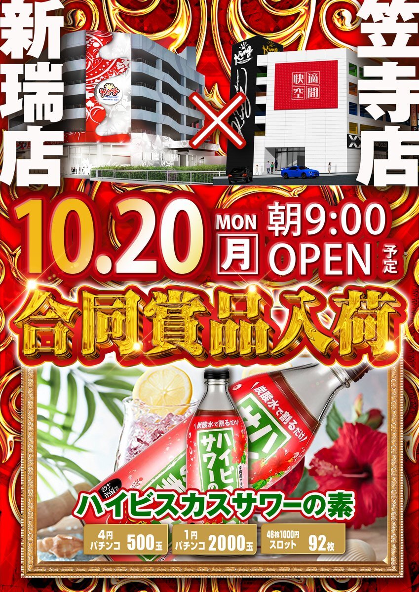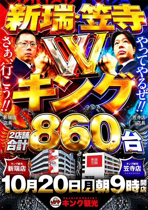 ども、つちのこです┏〇ペコ 本日10月20日(月) 🌈新台入替 朝9時開店🌈 全17機種20台導入予定( ・ㅂ・)و 👑新瑞×笠寺 Wキング👑 合同賞品も入荷予定ですよ\_(・ω・`)ココ重要! 入場は大通り側入口より並び順にて🚶‍♂️ 是非遊びに来てね(✌️'ω' ✌️) #新台入替 #新瑞 #Wキング pic.x.com/Z2eWGGeMVl