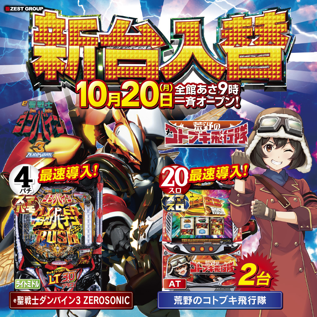 👑10月20日(月)👑 ゼスト「新台入替‼」 今回は話題の2機種新台導入予定‼ 是非お楽しみくださいませ♪ #e聖戦士ダンバイン3ZEROSONIC #L荒野のコトブキ飛行隊