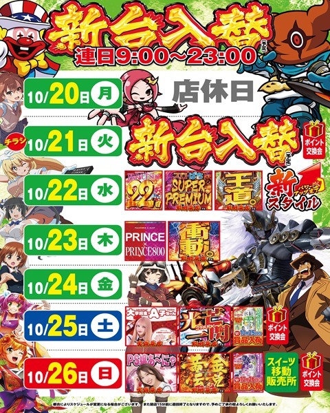 昨日は 🎯東京喰種コンプリート達成‼️ ⚡ゴッドイーター+6,000枚超! 本日10/20(月)🕘朝9:00OPEN 新台入替初日🔥 スロット ✈️荒野のコトブキ飛行隊 💥アレックス増台 🌺ホウオウ~天翔 他 20スロ新台は18時開放🕕 お仕事帰りでも間に合う! +4円パチンコ始動🎯 話題のスマパチ多数増 #新台入替 pic.x.com/gldcmRLrlR