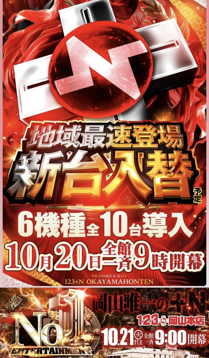 おはようございます(*^^*) 📍本日10月20日(月) 地域最速新台入替(予定) 抽選時間は15:30予定です🌷 皆様のご来店お待ちしております✨ #123岡山本店 #パチンコ #スロット #パチスロ #地域最速 #新台入替 pic.x.com/WyFw3Hqhix
