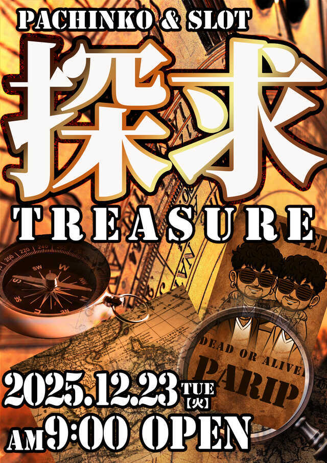 こんばんは。 マネージャーのKです。 🧭探求(TREASURE)🧭 自分なりの“楽しみ方”を探す一日。 細部まで目を向けた人だけが 気づける何かがある…かも? ▶️新台入替 ▶️12.23 9:00OPEN ▶️AM9:00 OPEN #周年月間 #スロット #新台 #秘宝伝 #沖ドキDUOアンコール pic.x.com/CqtRg3wuRR