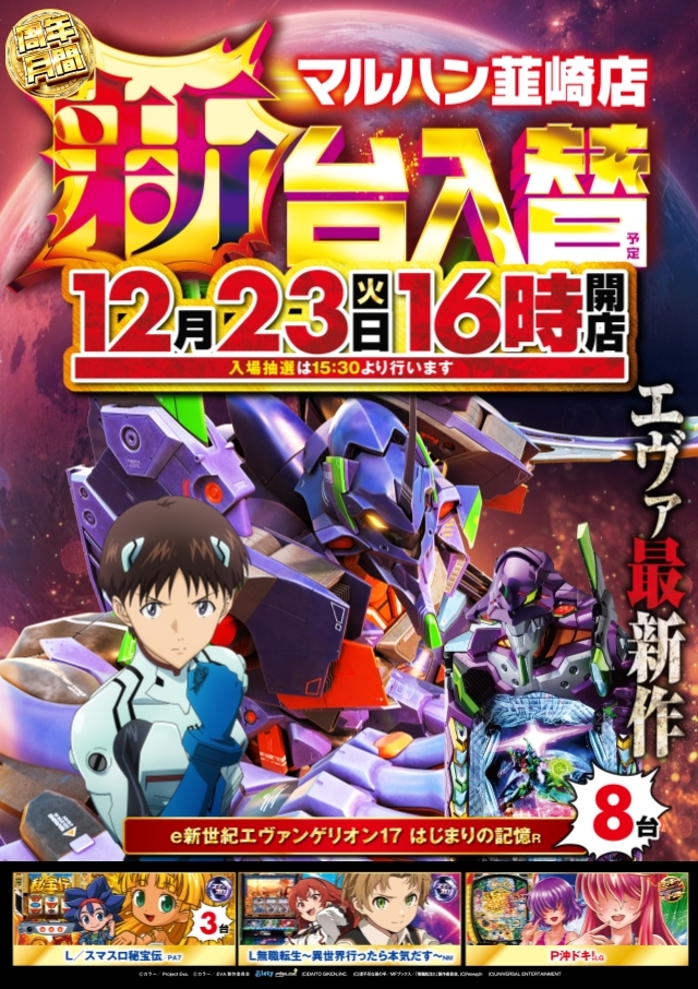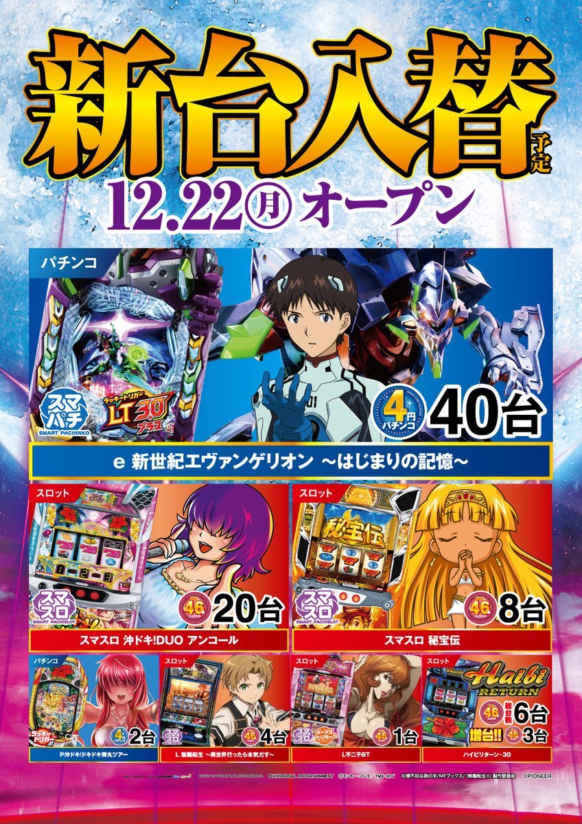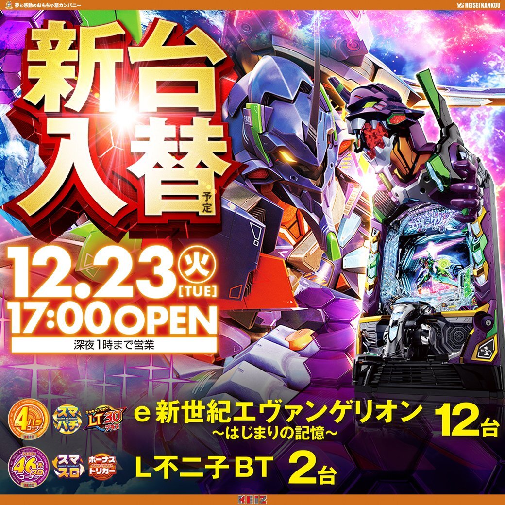 こんばんは✋ 12月23日(火)新台入替17時オープン‼️ 25時まで延長営業🌟 皆様のご来店お待ちしております😊 #新台 #エヴァ17 pic.x.com/sOft6cNkAF