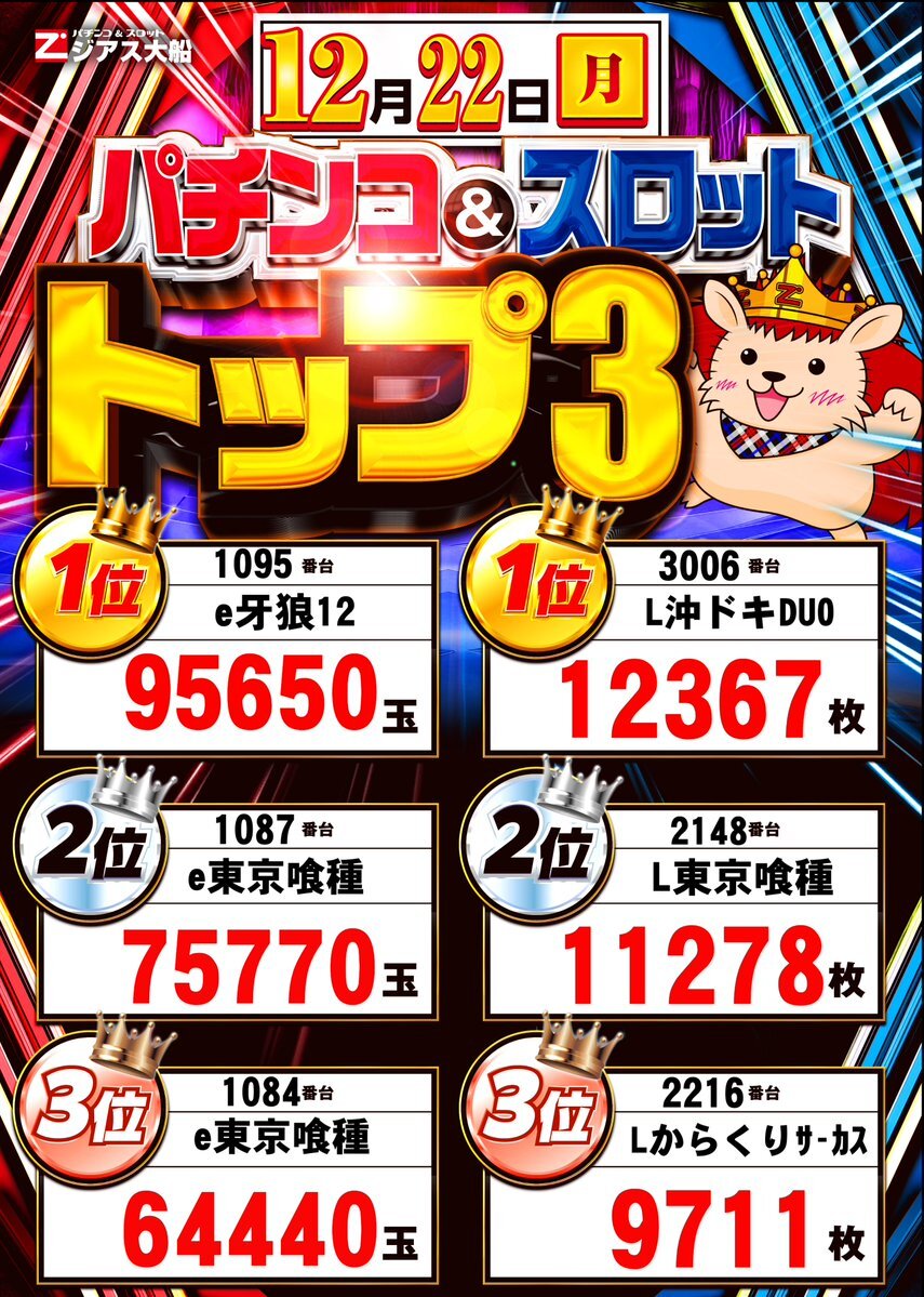 ジアス大船です おはようございます! 12/22の ランキングはこちら!! やはりジアスと言えば、、 さすがの活躍!!! #新台 #東京喰種 #牙狼 #コンプ #からくり pic.x.com/Jhk81oo3hy