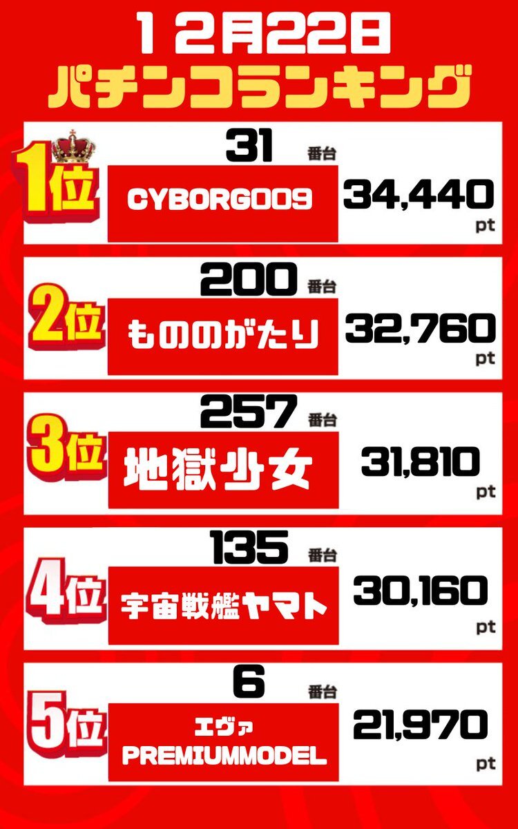 12/22 出玉ランキング 12月は【🔥周年月間🔥】 12月23日は新台入替✨ 最新エヴァも大量導入‼ ぜひ本日もお楽しみください‼ #ランキング #エヴァ #新台 #秘宝伝 pic.x.com/KA27PKE82L