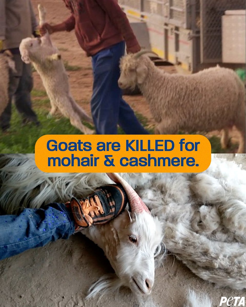 There’s no retirement home for animals abused by the fashion industry.   If the goats don’t die from exposure to freezing temperatures, neglect, or violent shearing, they’re sent to slaughter 💔