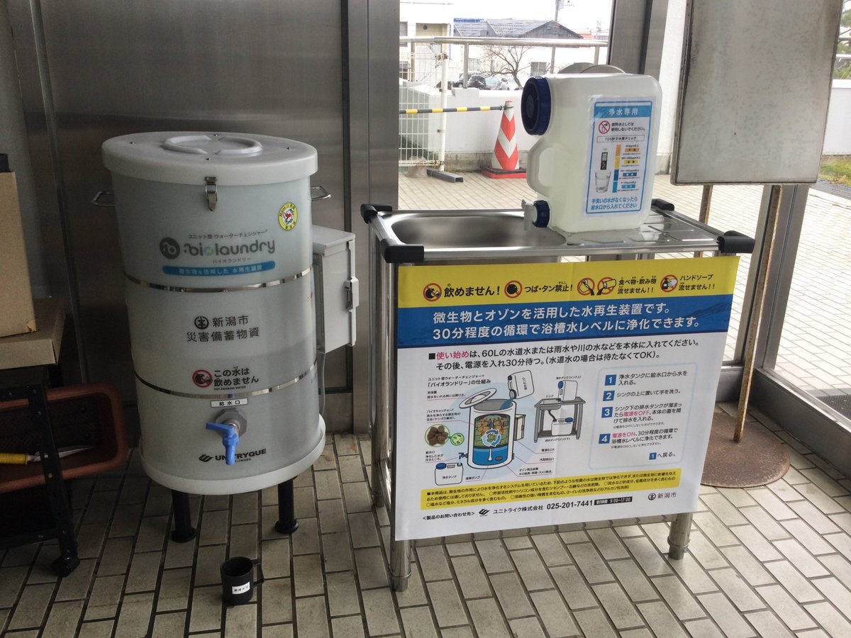 【水再生装置を設置しました💧】 災害時などに活用できる「水再生装置」を区役所2階玄関に設置しました! 微生物とオゾンの力で、雨水や川の水を30分程度で浴槽水レベルに浄化できます✨ ※飲み水にはできません #新潟市南区 #防災 pic.x.com/1GvkGZuFhV