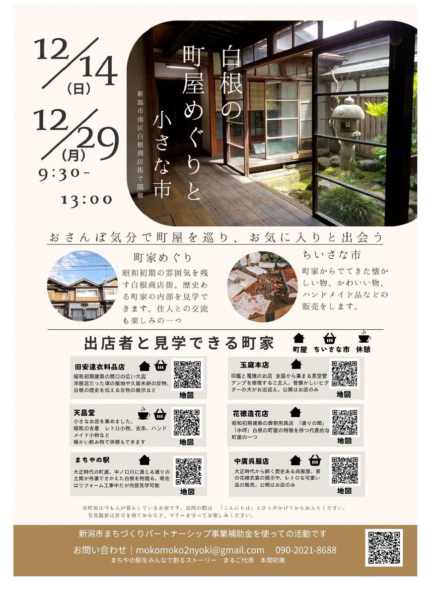 【🚶♀️#白根の町屋 めぐりと #小さな市🚶】 白根商店街を各自でめぐり、昭和初期の雰囲気を感じてください🏘️ 町屋の見学だけでなく、眠っていた懐かしい物やかわいらしい物、ハンドメイド品の販売もあります👛 🏷️12/14(日)・29(月) 9:30~13:00 白根商店街でお待ちしております♪ #新潟市南区 pic.x.com/eN4nrqa4jR
