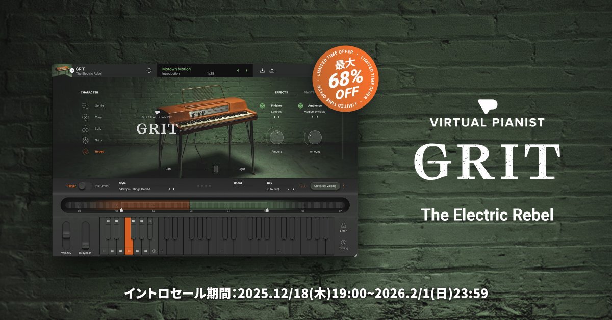 【UJAM新製品情報🎉】 『Virtual Pianist GRIT』1950年代のWurlitzer 120を元にしたピアノ音源🎹🔥 どの時代のグルーヴにも自然に溶け込みながら "ざらついた鳴り"と"存在感"を提供します✨ ピアノの演奏スキルがなくても大丈夫🎶 今すぐチェック👇 minet.jp/contents/promo… #UJAM #DTM #新製品 pic.x.com/pbNeuUpezC