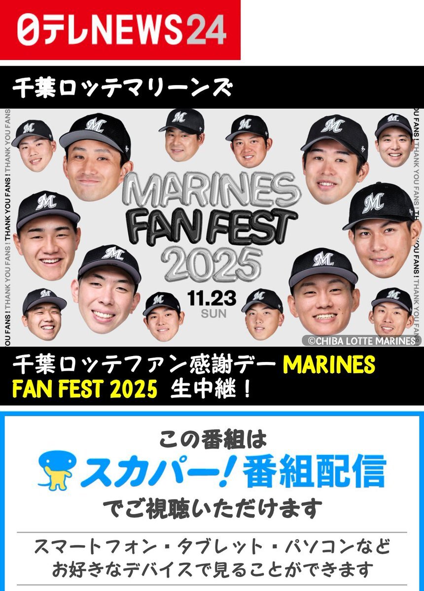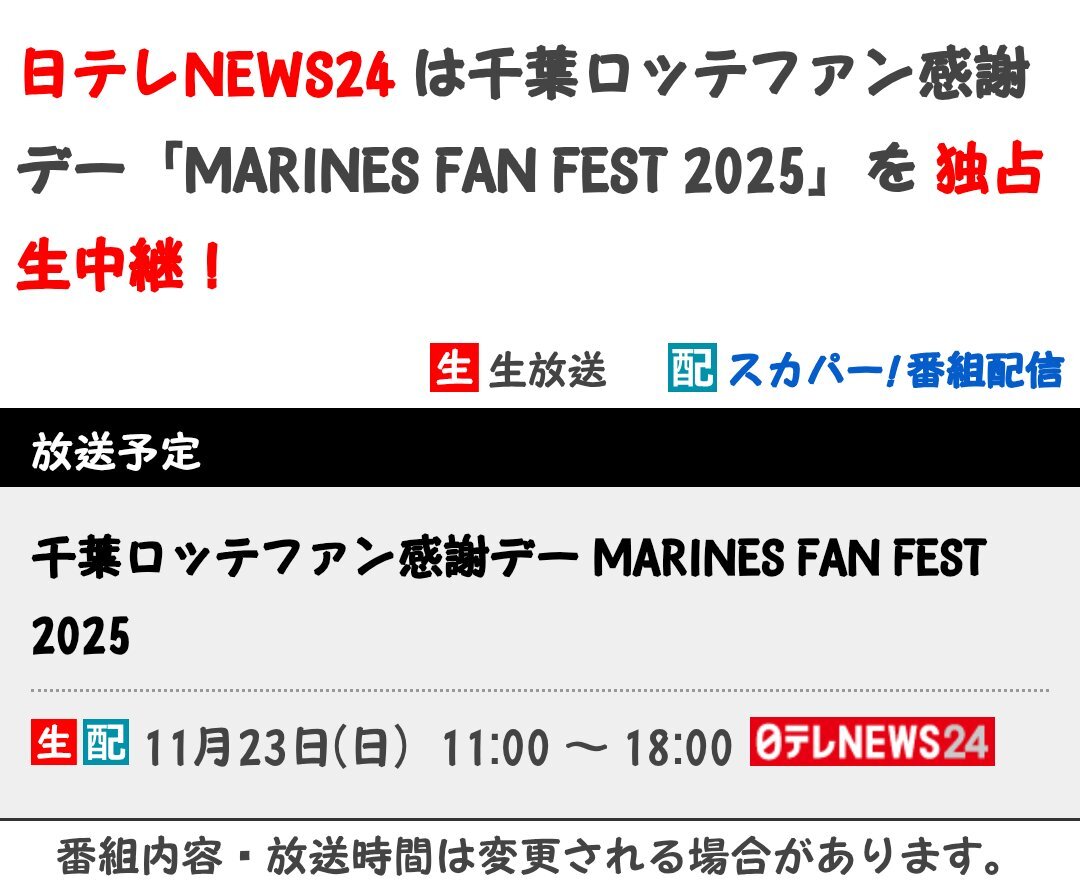 #日テレNEWS24 での 中継時間が決定しました‼️ / 11月23日(日・祝) 11:00~ 生中継 📺📱 \ 📣応援リポーターは #ぺこぱ のお二人 🎤MCは #清水久嗣 アナ&#倉持明日香 さん そして!今年は #スカパー番組配信 📱でも 見られます👀💖 🏟現地参戦の方も 待機列にお並びの間に是非❗ pic.x.com/KzL5edjzhj x.com/chibalotte/sta…