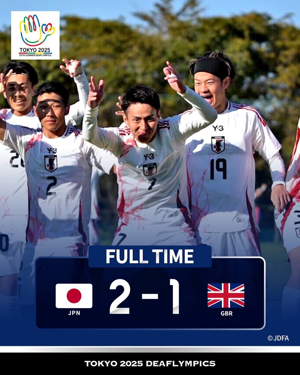 【速報!🇯🇵東京2025デフリンピック 準々決勝 イギリス🇬🇧戦】 日本🇯🇵 2-1 イギリス🇬🇧 得点者:岡田拓也1点、西1点 ↓西大輔選手コメント 前半開始早々、直接FKで先制され苦しい状況がずっと続きましたが、皆様の声援のおかげで後半ひっくり返すことが出来ました!