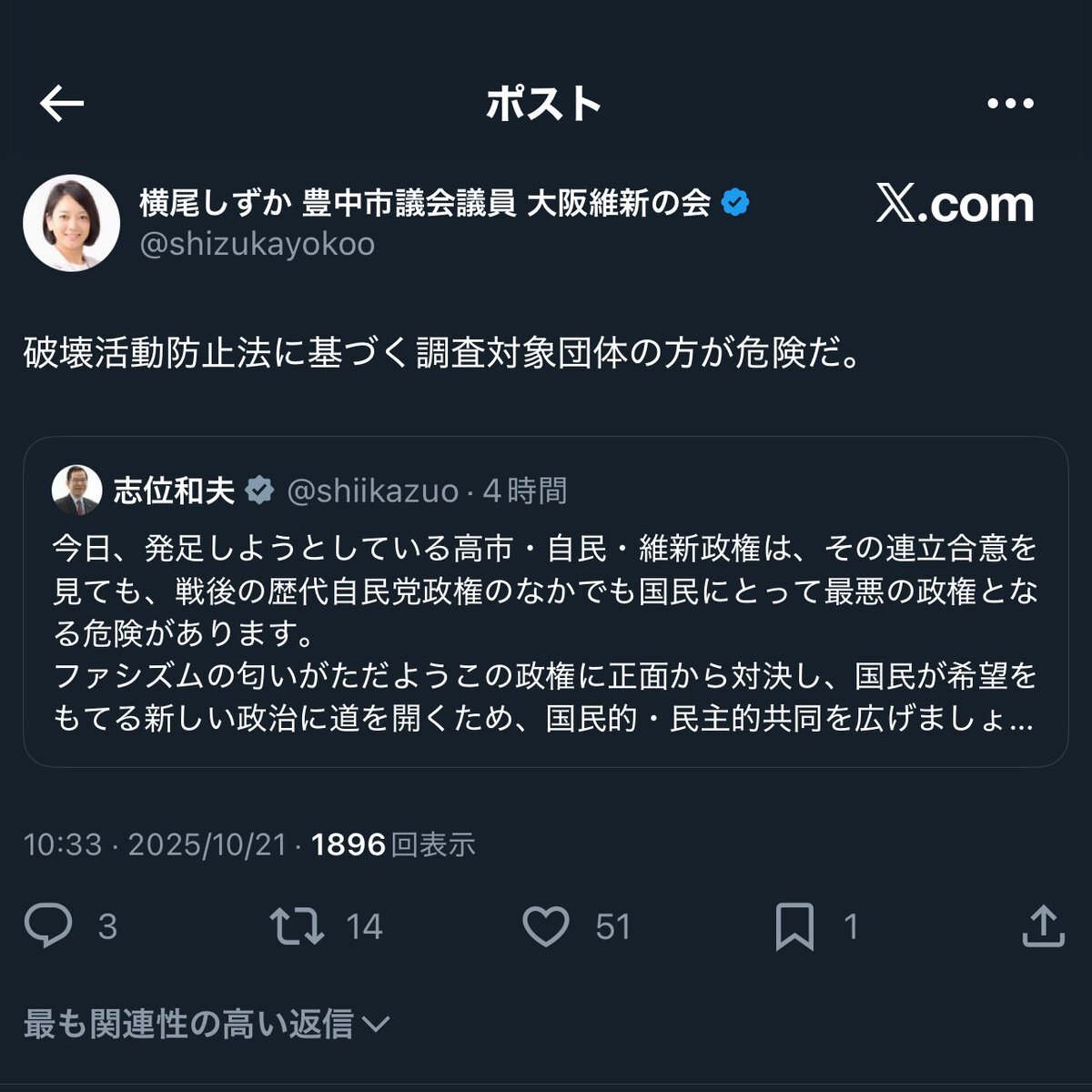 返信先:@shizukayokoo#維新 #横尾しずか 豊中市議が極悪カルト旧 #統一教会 のような反共に振り切れてるな(呆 #日本共産党 に「破防法に基づく調査対象団体」とレッテルを貼りながら六十年超何の根拠も挙げられない無能集団=公安の主張を鵜呑みかよ(嘲 pic.x.com/A6ItqZBOsO