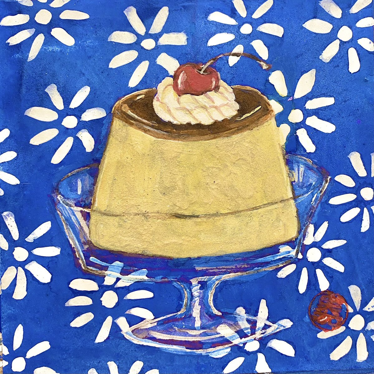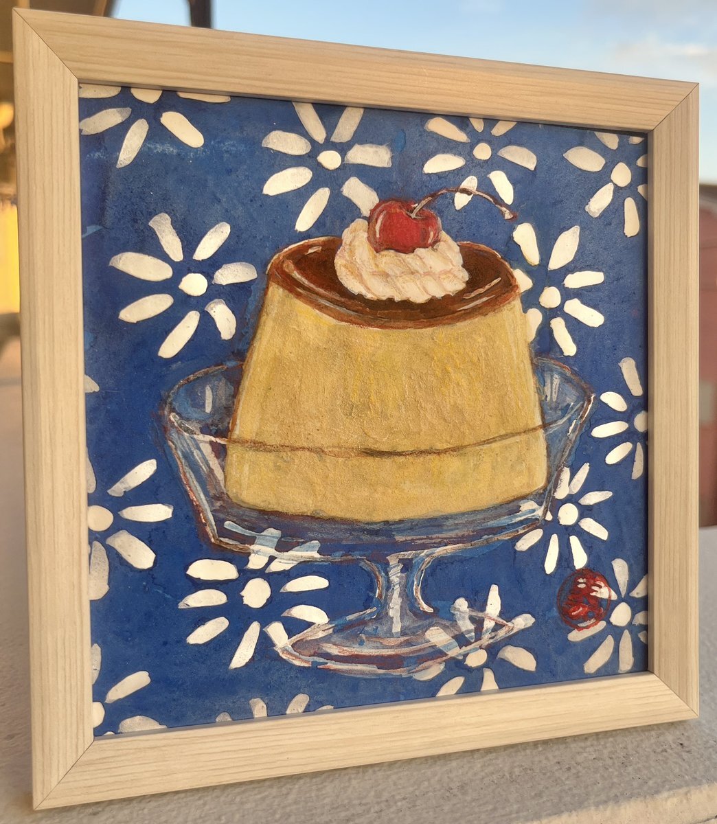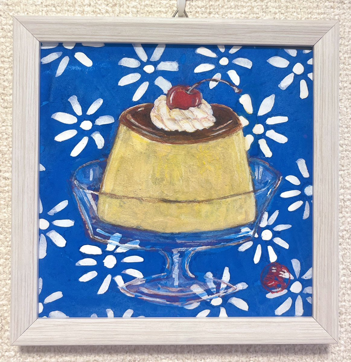 ガラスの上に、甘さがひとつ。 小さな正方形の日本画です。 「プリン」 雲肌麻紙、岩絵具 16.8cm×16.8cm(額込み) #日本画 #小さな絵 pic.x.com/QHliC0nH15