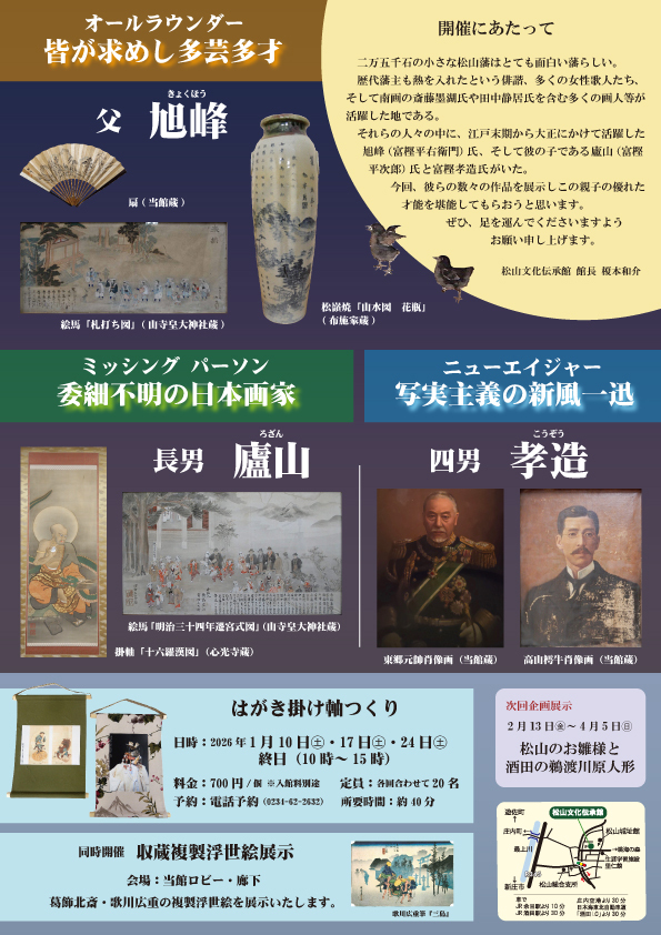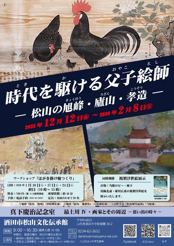 ―次回企画展お知らせ― 【時代を駆ける父子絵師 ―松山の旭峰・廬山・孝造―】 会期:2025年12月12日~2026年2月8日 開館時間:9:00~16:30(入館は16:00まで) 休館:毎週月曜日(祝日の場合は翌日休館)・年末年始(12月29日~1月3日) #酒田市松山文化伝承館 #山形県 #酒田市 #日本画 #油絵 pic.x.com/vTJRuODtPF