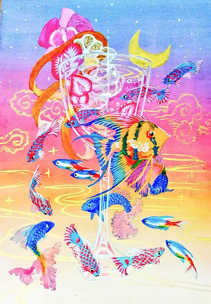 百熱帯魚図 完成! 少し色とびしてて線が消えて見えるのと、金やラメが写ってないのは写真のせい #日本画 pic.x.com/gFO0dSxzUP