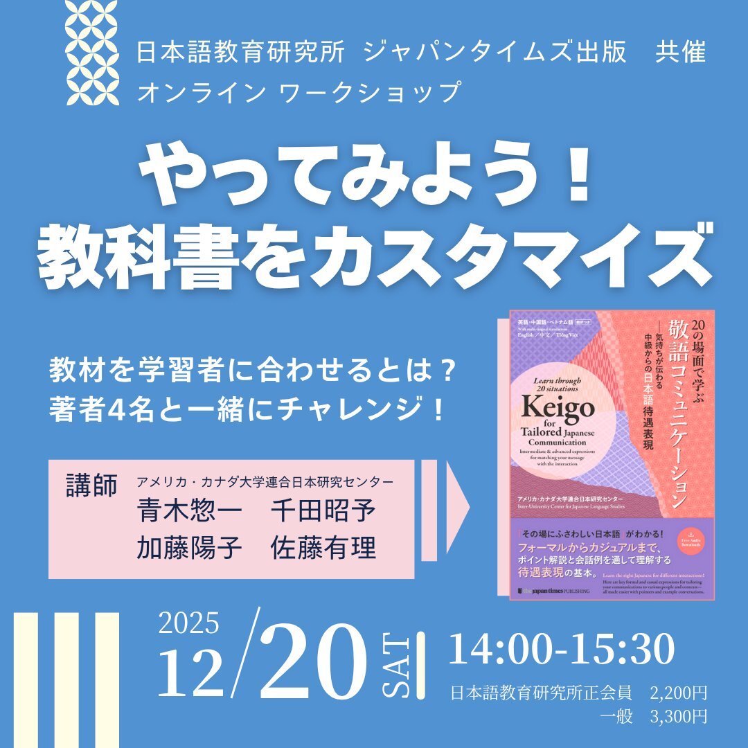 🚀 オンラインワークショップ 12/20(土)「やってみよう!教科書をカスタマイズ」 教科書の会話文をご自身の生徒さんの環境に合うようにカスタマイズしてみるワークショップです。 ご参加の方には、使用教材の一部をPDFでお渡しします。 申込:forms.gle/aXiaU8SZwE8CVx… #日本語教師 #ワークショップ pic.x.com/7XRQx63RFN