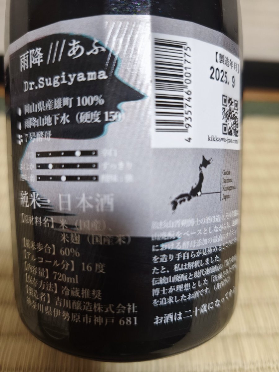 神奈川県伊勢原市、吉川醸造の雨降Dr.Sugiyamaです ふくよかで程よい酸味のある辛口です 東京大学の故・杉山晋朔博士が追求した山廃と速醸のバランスを追求した酒母造りを目指した酒だそうです #吉川醸造 #雨降drsugiyama #純米吟醸 #岡山県産雄町 #神奈川県の酒 #伊勢原市 #日本酒 #日本酒で乾杯 pic.x.com/fVhE86HBDa