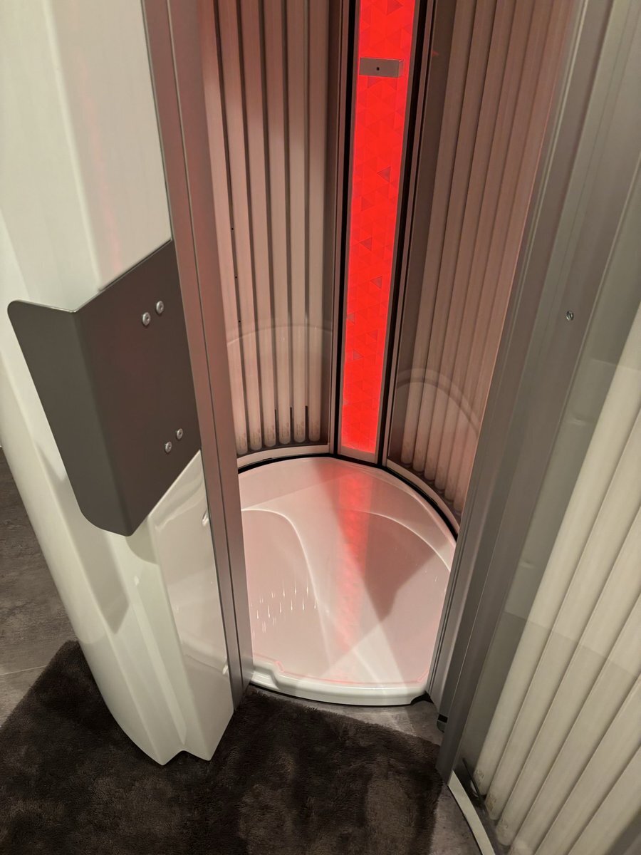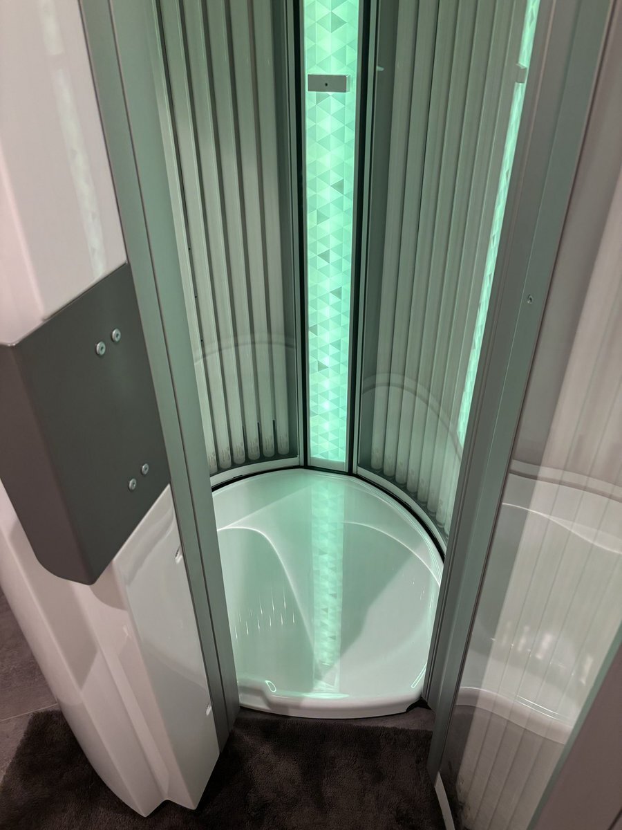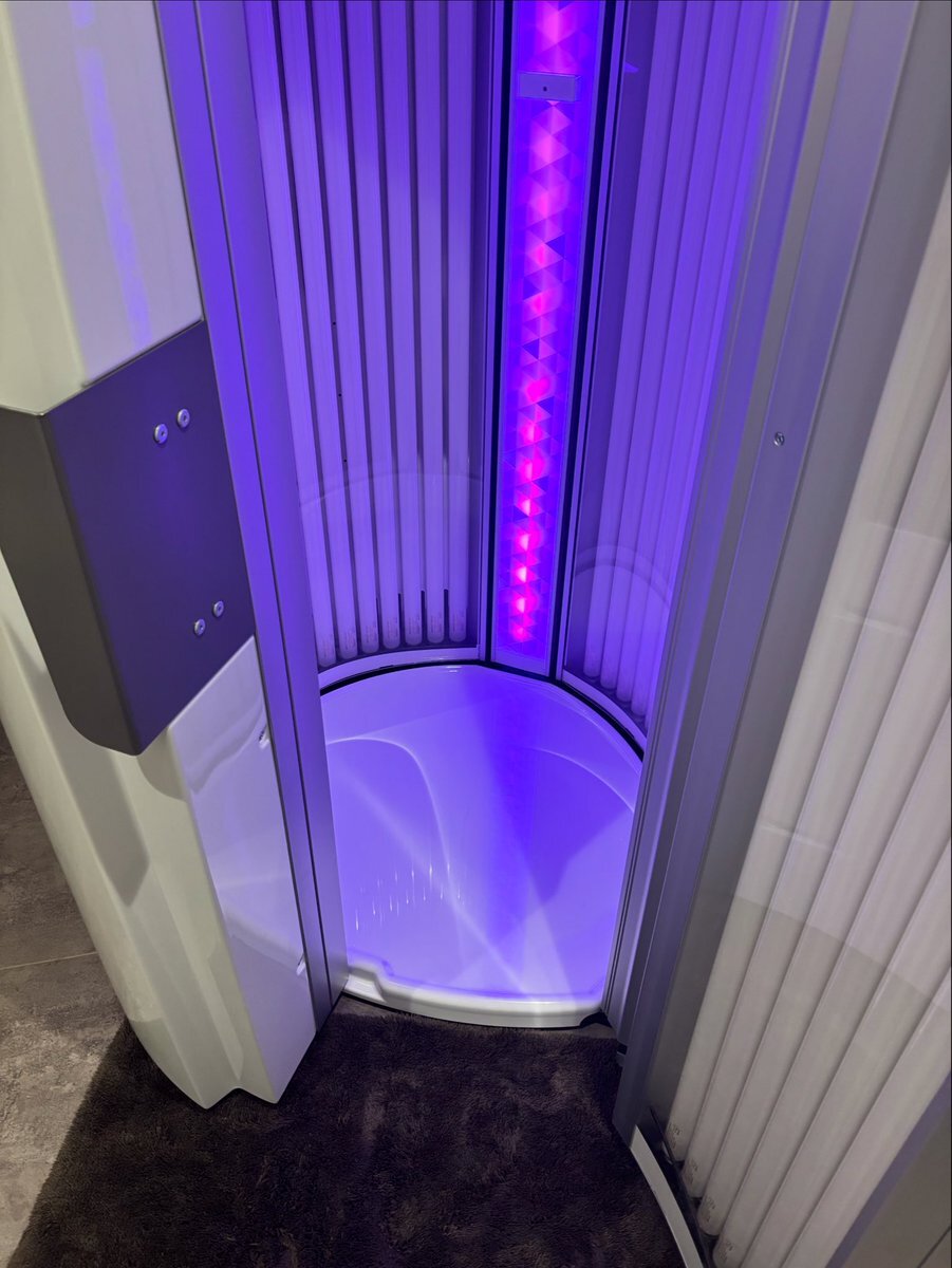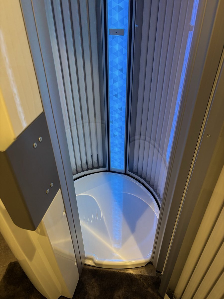 タンニングマシン(日焼けマシン)、脚が全然焼けなくて悲しい🥹 今日3回目入ってくるけど、いい加減、多少でもいいから黒くなれ〜😤 午後タンニングマシン3回目入り行きます🫡 #タンニングマシン #日焼けマシン #ジム