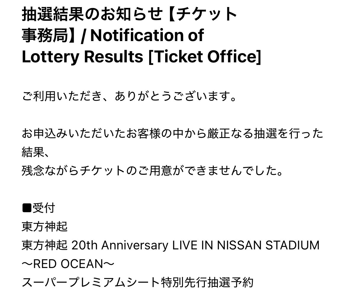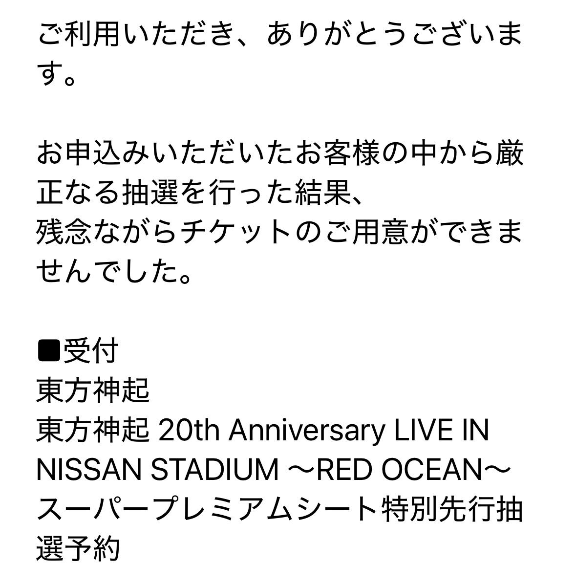 落選(T . T) 長年ビギしてるけど、当選した事ないです。当選するにはコツがいるのかな⁇ 当選された方おめでとうございます㊗️ #東方神起 #日産スタジアム #RedOcean pic.x.com/ZCDzGa50Ss