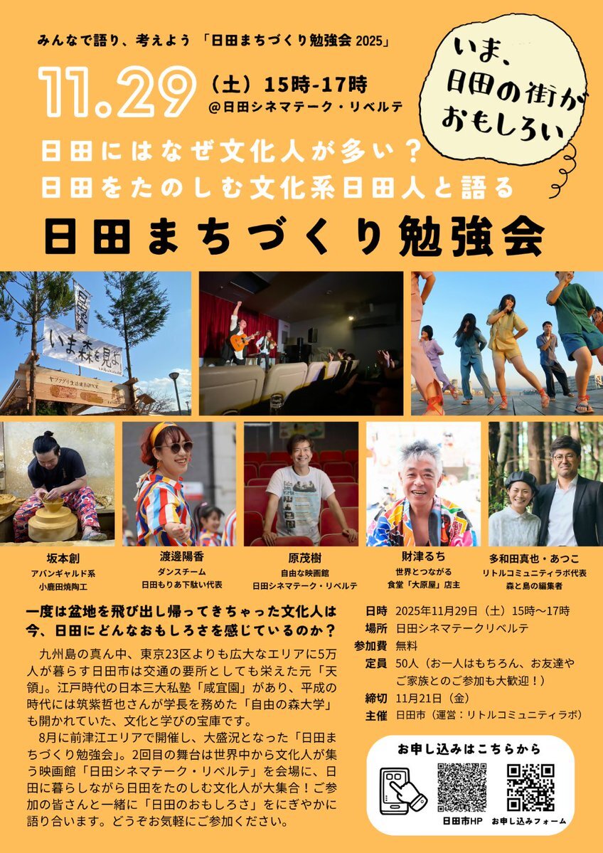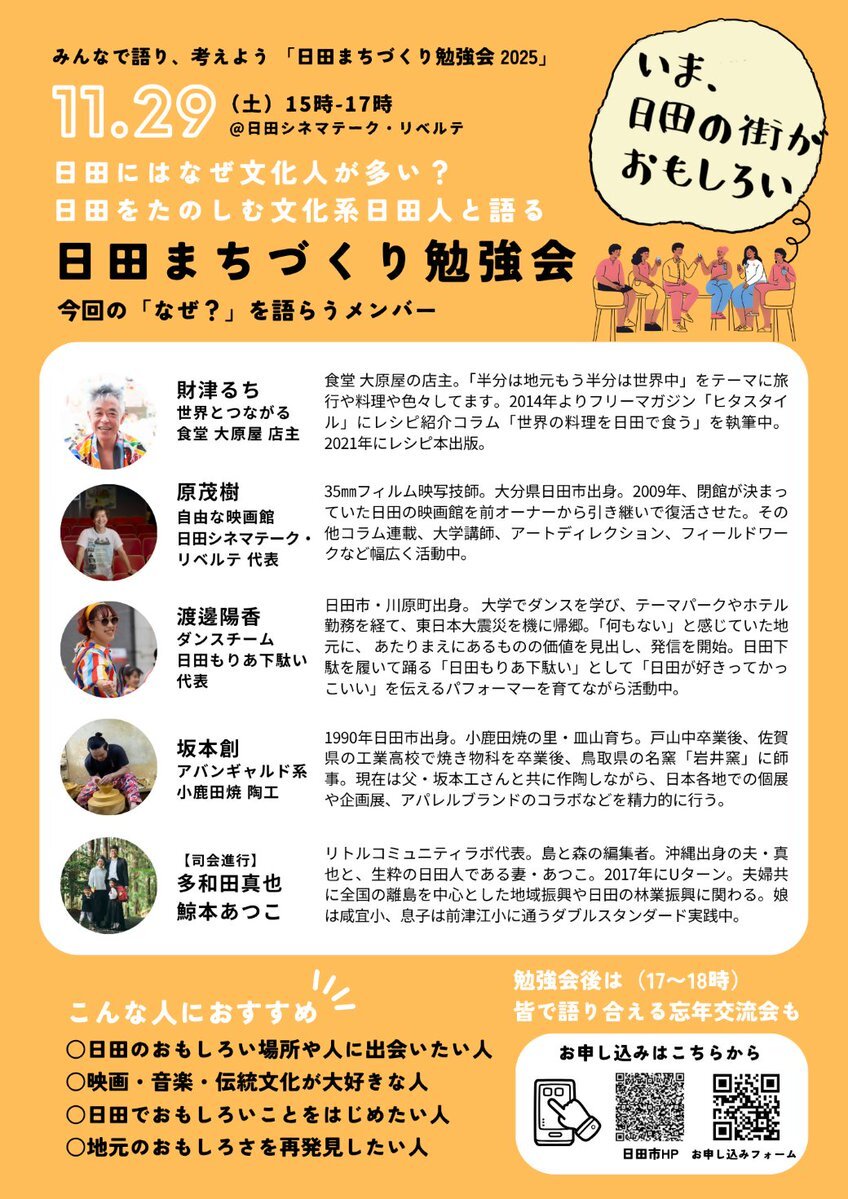 😃「日田のおもしろさ」を賑やかに語らんかい?😃 日田にはなぜ文化人が多い?日田をたのしむ文化系日田人と賑やかに語り合う「日田まちづくり勉強会」を開催します。是非、ご参加ください🍀 city.hita.oita.jp/soshiki/kikaku… #日田市 #日田 #大分県日田市 #hita #まちづくり pic.x.com/bKHTYZEND4