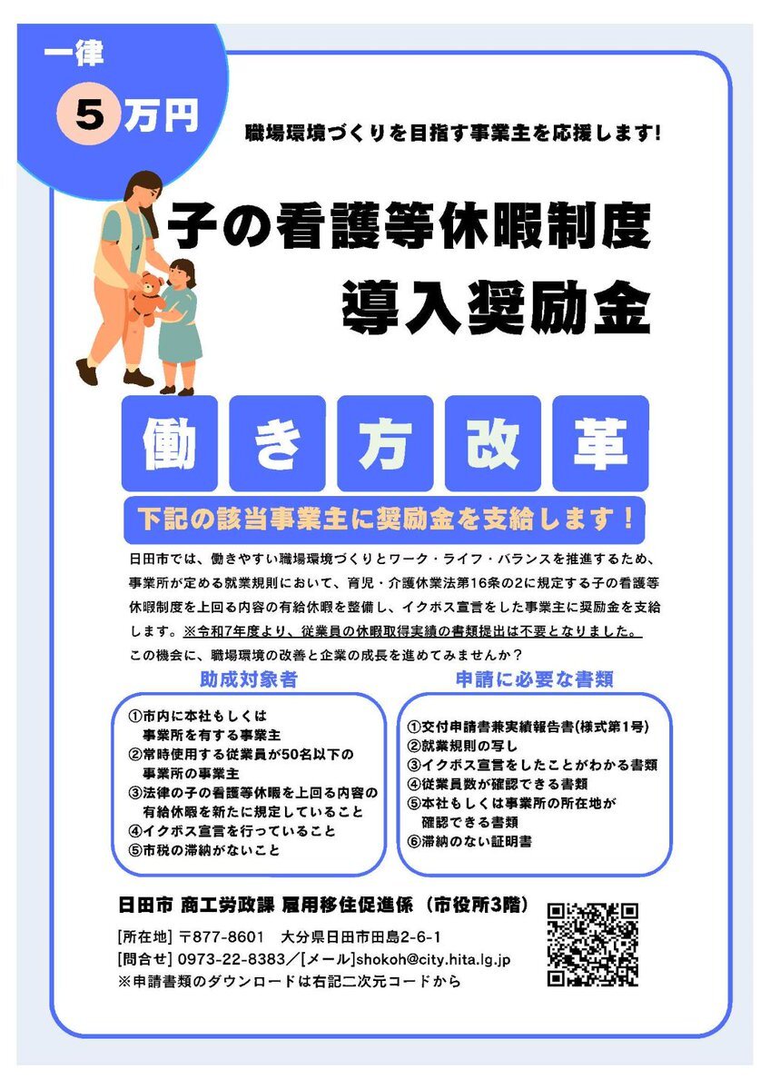 「子の看護等休暇制度 導入奨励金」🌈 日田市では、新たに有給休暇として「子の看護等休暇」を導入し、"イクボス宣言"をした事業主に奨励金を支給します🍀 city.hita.oita.jp/soshiki/norins… #日田市 #日田 #大分県日田市 #hita #働き方改革 #子の看護休暇 #イクボス pic.x.com/EfpQvFWFJ5