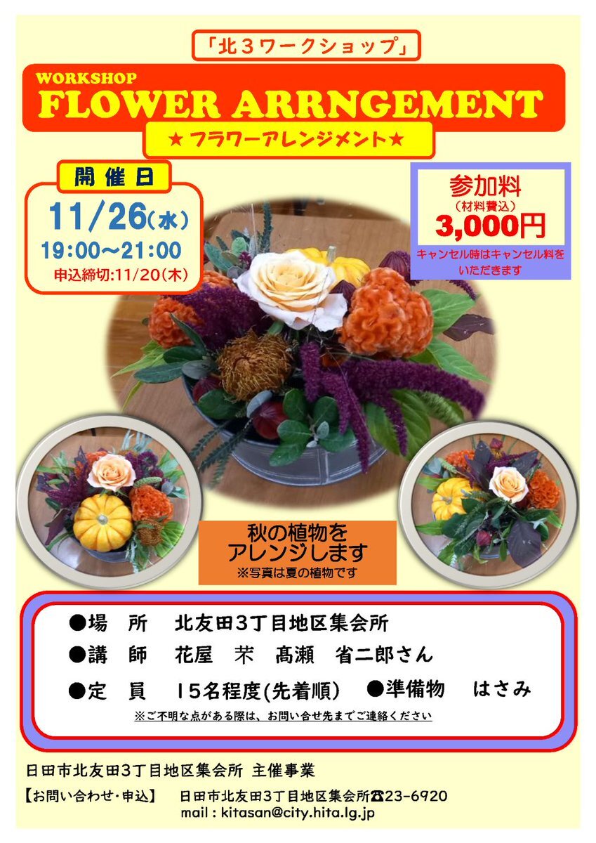 🎈北3ワークショップ🎈 💐フラワーアレンジメント💐 「花屋 芣(ふう)」の髙瀬さんを講師に迎え、秋の植物をアレンジします🌼 city.hita.oita.jp/soshiki/shimin… #日田市 #日田 #大分県日田市 #hita #むくの木ワークショップ #フラワーアレンジメント pic.x.com/NrqWFIXkuC