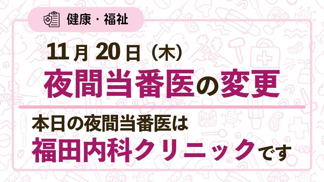 📢夜間当番医の変更について🍁 本日、11月20日(木)の夜間当番医(午後7時~9時)が変更になりました。 ■本日の夜間当番医 福田内科クリニック 日田市大宮町1228-1 ☎0973-25-5188 11月の当番医についてはこちら⬇️ city.hita.oita.jp/soshiki/fukush… #日田市 #日田 #大分県日田市 #hita #当番医 pic.x.com/icyxjqh4By