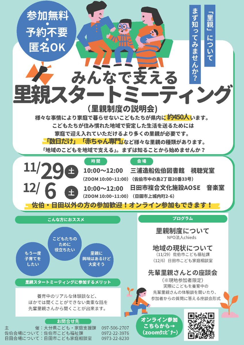 里親スタートミーティング(説明会)を開催します🚩 県内には、様々な事情によって、家庭で暮らせない子どもたちが約450人います。 「数日だけ」「赤ちゃん専門」など、様々な里親の種類があります🍀まずは知ることから始めませんか。 city.hita.oita.jp/soshiki/fukush… #日田市 #日田 #里親 #里親説明会 pic.x.com/Xu7z2KQ1qN
