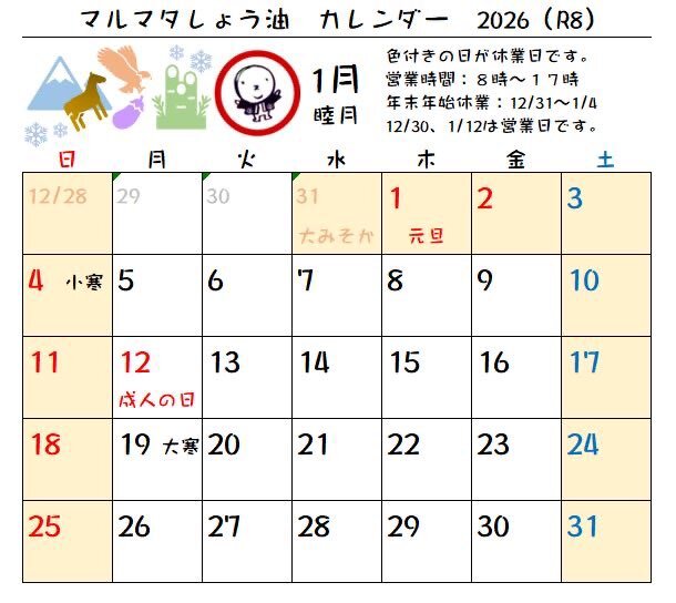 ✨️🗻🦅1月営業カレンダー🍆🐎✨️ 色つきの日が休業日です。 1月は5日㈪より営業開始、成人の日は営業します。 定番商品は日田市内スーパー・ドラッグストア・生協さんでも購入可能です🛒³₃ ネットストア marumata-s.com #醤油 #味噌 #いつもの醤油 #おかき #soysauce #大分 #日田 pic.x.com/w0smKF7g4s