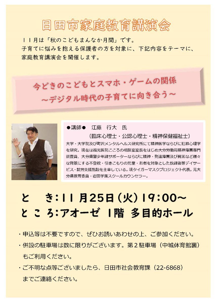 👧11月は「秋のこどもまんなか月間」です👦 「今どきのこどもとスマホ・ゲームの関係~デジタル時代の子育てに向き合う~」をテーマに、家庭教育講演会を開催します🍀 事前申込は不要。お気軽に聴講してみませんか☺️ city.hita.oita.jp/soshiki/kyoiku… #日田市 #日田 #大分県日田市 #家庭教育 #講演会 #子育て pic.x.com/TKsEIRxiPL