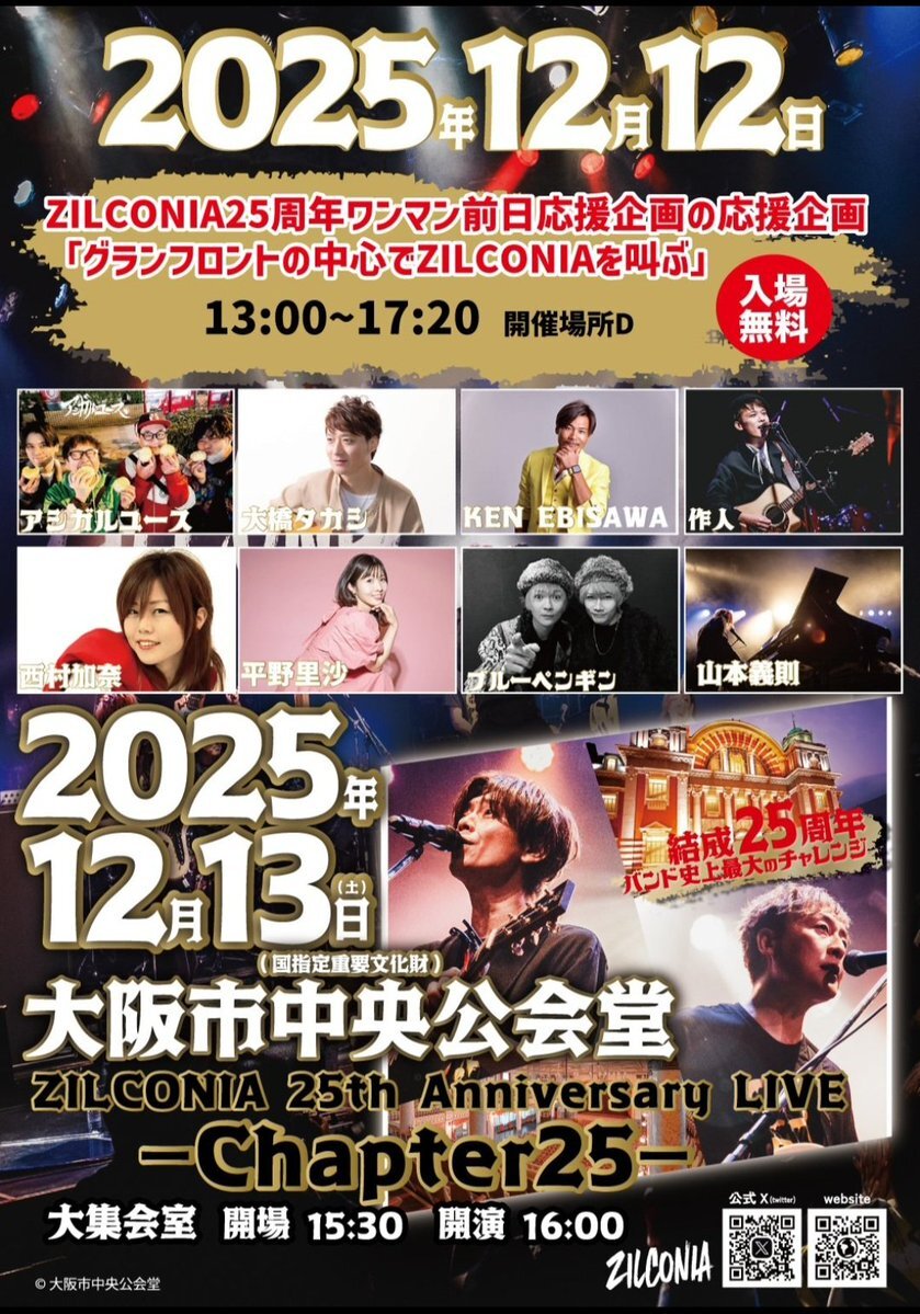 📣タイムテーブル公開!!! そして、先ほどのZILCONIA配信でこのイベントは そよかぜ大根雄馬 がMCと進行をしてくださる事に決定!!!!!✨✨ 2025年12月13日(土) ZILCONIA25周年応援企画 「魂の一曲入魂〜もっと歌わせんかい!〜」 ◤入場無料◢ <場所> 大阪市中央公会堂 中集会室(三階)