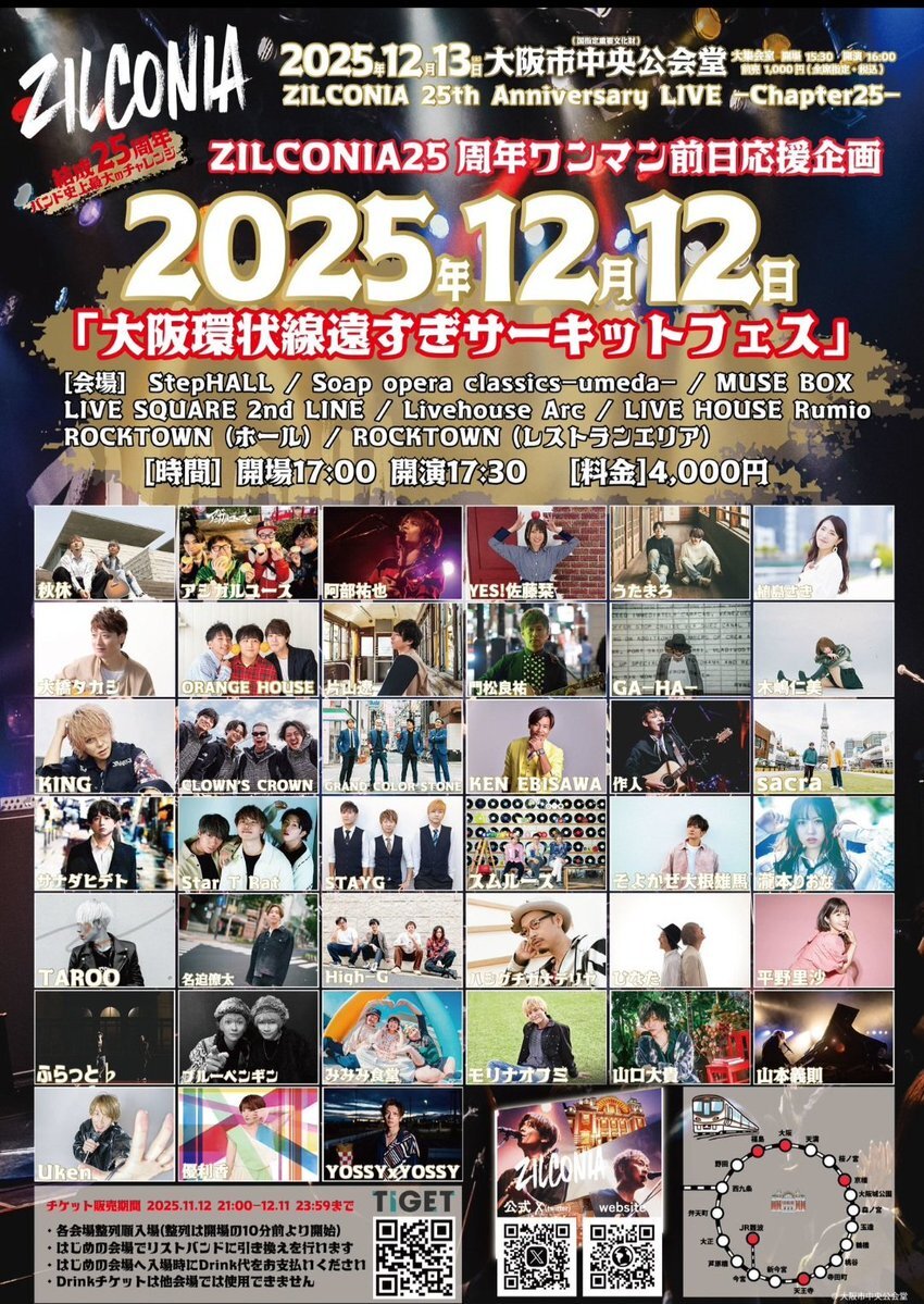 明日のサーキットフェス!! 皆様への案内を1枚にまとめました!! こちらご確認ください💁 当日券の販売 LIVEHOUSE Rumioでのみ販売 当日券の価格 4,500円 *アーティスト取り置きは今回は対応なしです。 グッズタオルの販売 各会場受付にて販売!! 2025年12月12日(金) ZILCONIA