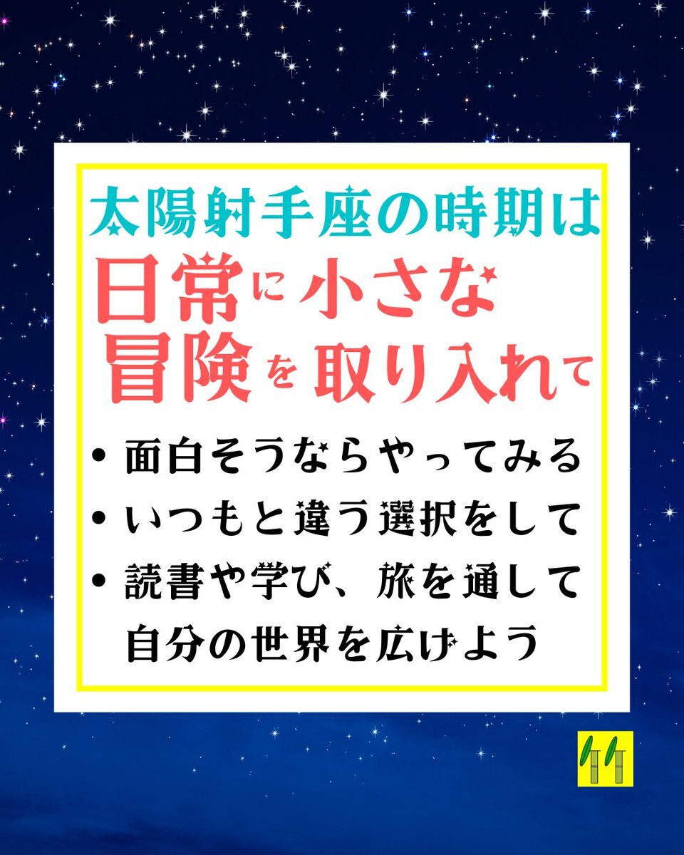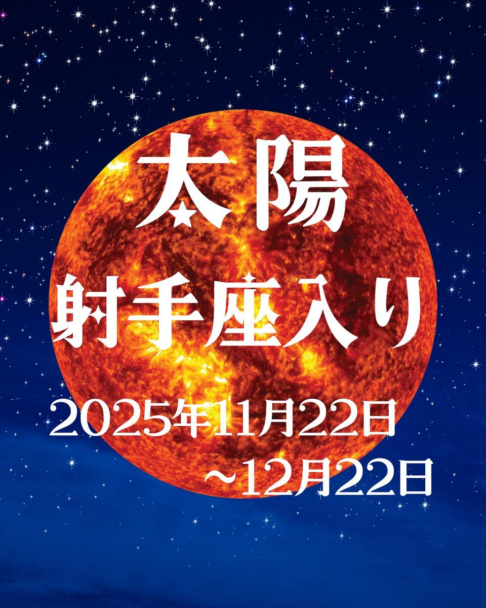 【太陽射手座入り】 11/22(土)10:36に、太陽が射手座に入ります。 太陽は、顕在意識や意志を表す天体です。 射手座らしい方向に意識を向けると、充実した1ヶ月になるかもしれません♪ #星占い pic.x.com/6ETrYX7ASH