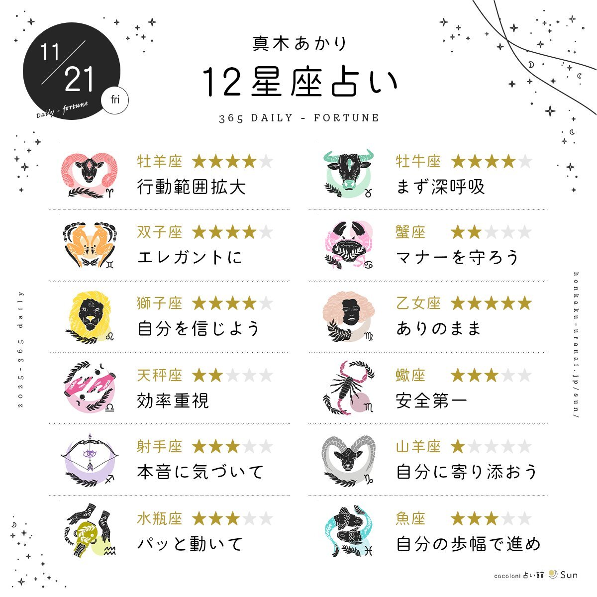 【11月21日の12星座占い】 全体運をひとことで表すと? 恋愛、仕事、お金、健康運はこちら↓ honkaku-uranai.jp/daily/horoscop… 監修:真木あかり(@makiakari)さん #占い #明日の運勢 #星占い #11月21日 pic.x.com/j7QY9Blf2d