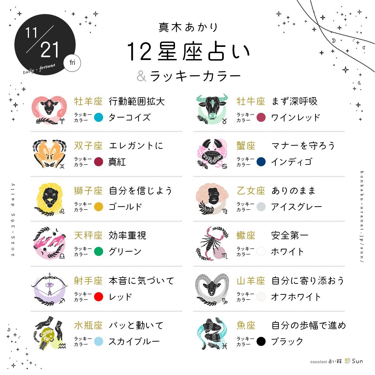 【11月21日の12星座占い】 今日のひとこと運勢とラッキーカラーはこちら たっぷり読みたい方は↓ honkaku-uranai.jp/daily/horoscop… 監修:真木あかり(@makiakari)さん #占い #今日の運勢 #星占い #11月21日 #ラッキーカラー pic.x.com/xvvzgrIbVO