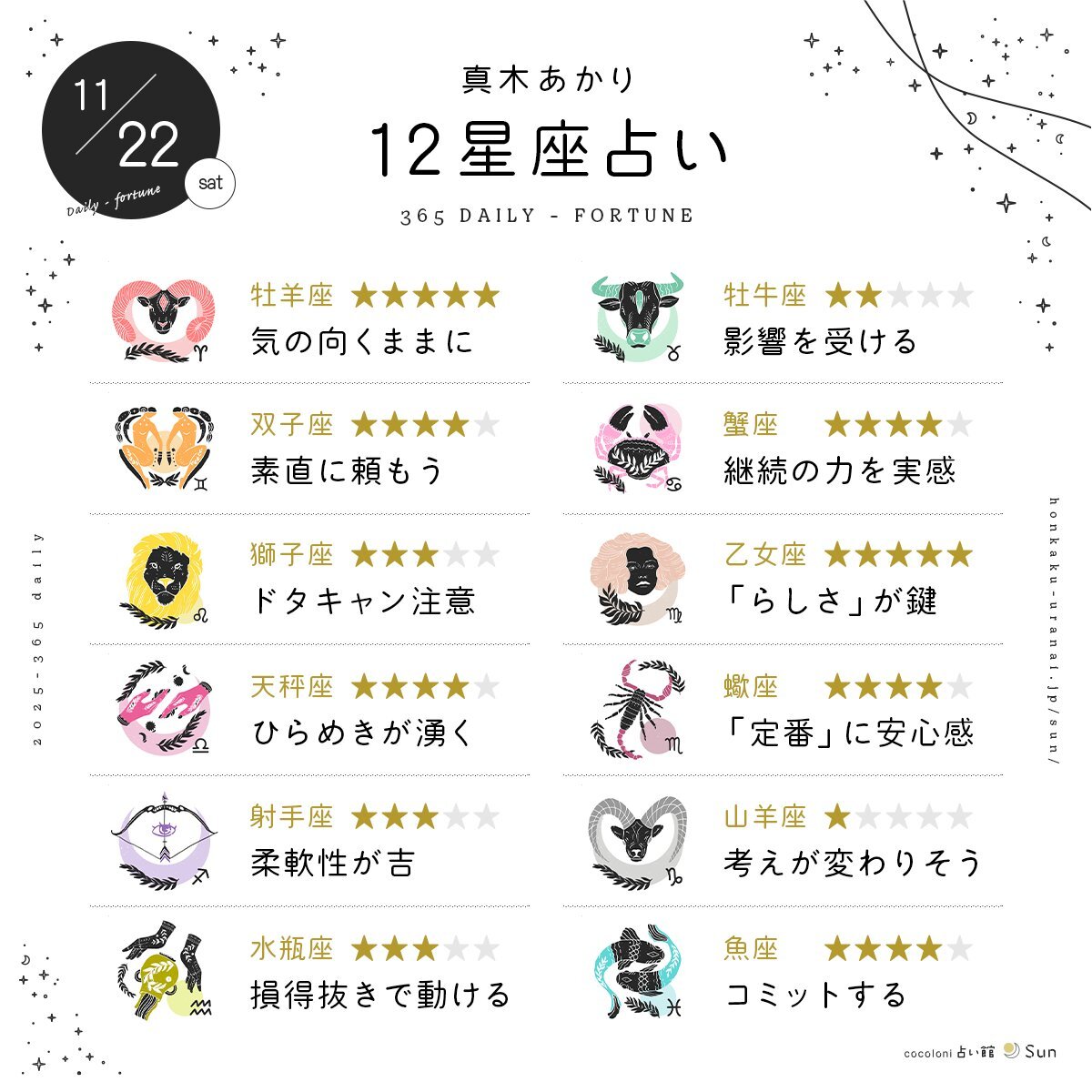 【11月22日の12星座占い】 全体運をひとことで表すと? 恋愛、仕事、お金、健康運はこちら↓ honkaku-uranai.jp/daily/horoscop… 監修:真木あかり(@makiakari)さん #占い #明日の運勢 #星占い #11月22日 pic.x.com/ZXNCyzpZeM