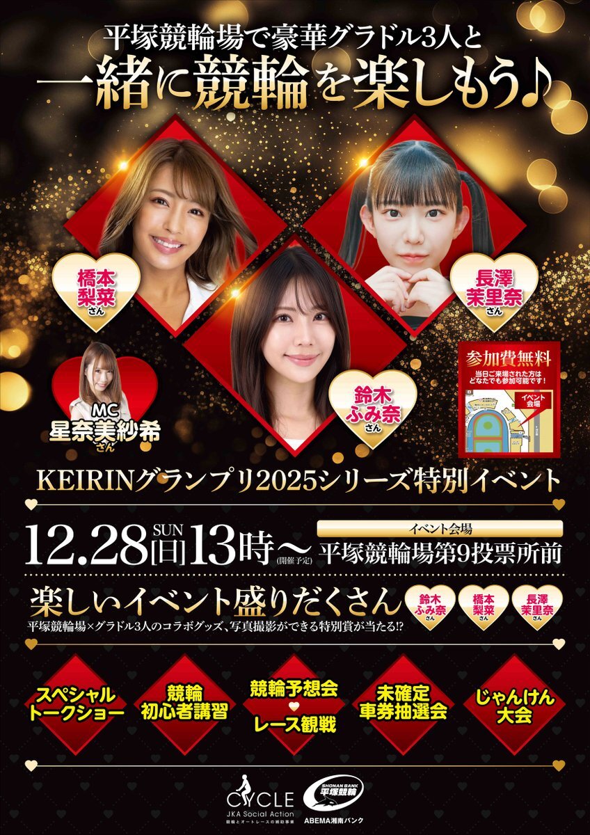 【🎉特別イベントのご案内🎉】 📅 12/28(日)13:00〜 #KEIRINグランプリ2025 シリーズ初日 に ✨豪華グラドル3⃣名が来場✨ 💁♀️#鈴木ふみ奈 さん 💁♀️#橋本梨菜 さん 💁♀️#長澤茉里奈 さん 🎤 MC: #星奈美紗希 さん コラボグッズが当たる 未確定車券抽選会 も開催✨ 🚴♀️ pic.x.com/JgwNCEkmPq x.com/windy_kun/stat…