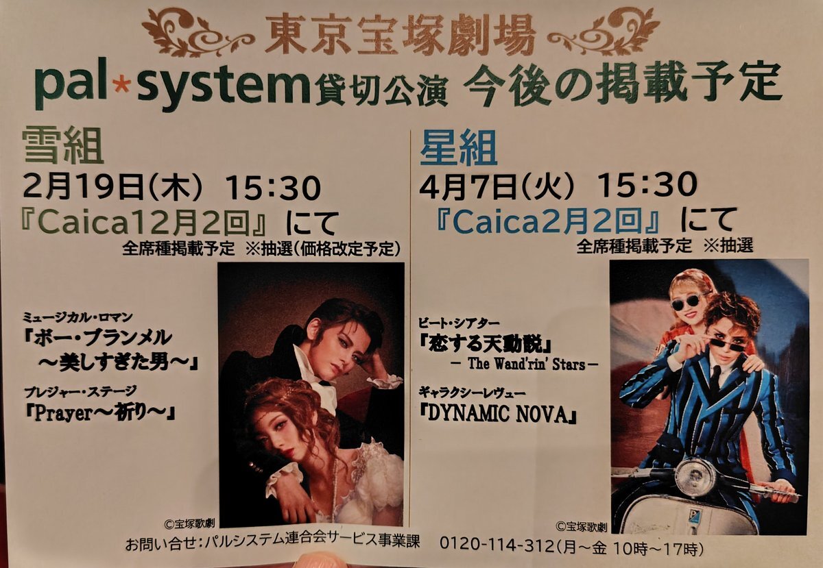 パルシステム🐮貸切公演、今後の掲載予定 ・雪組12月2回(公演日2/19 15:30) ・星組2月2回(公演日 4/7 15:30) #東京宝塚劇場 #パルシステム貸切公演 #雪組 #星組 pic.x.com/lSD917FbvA