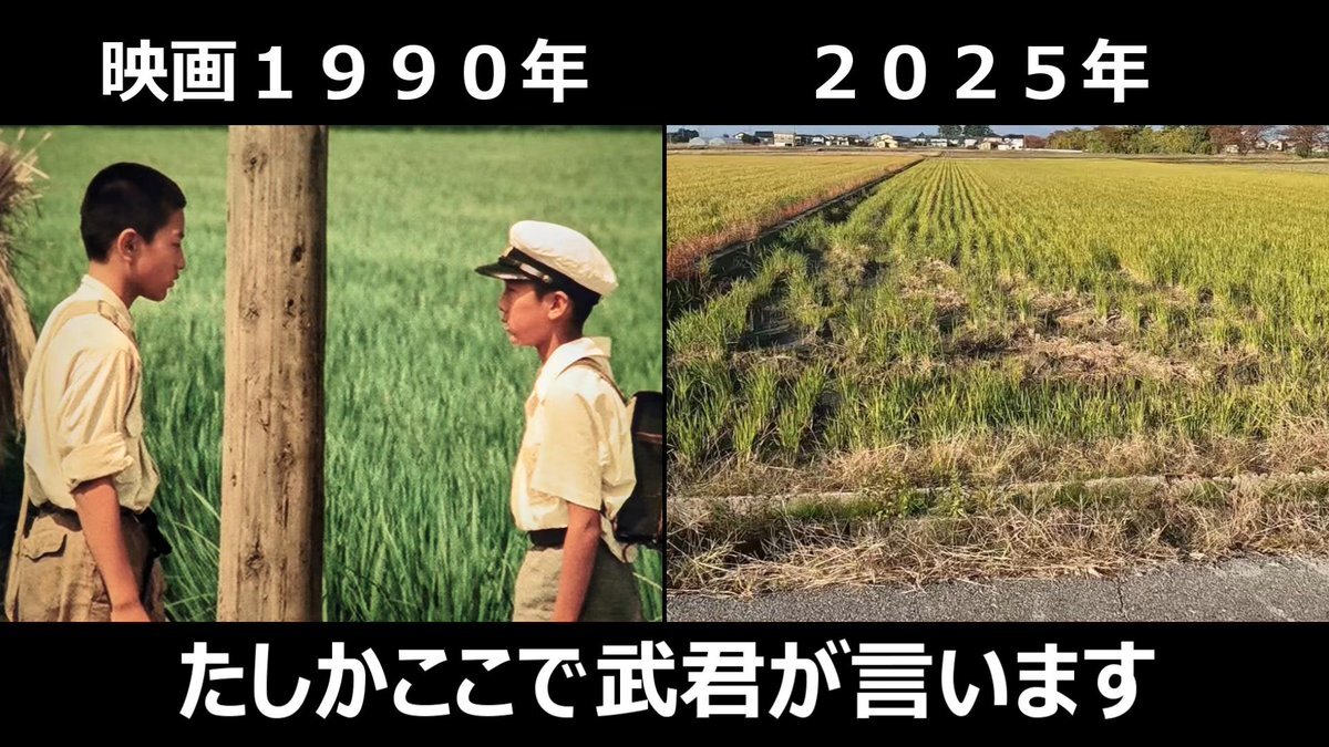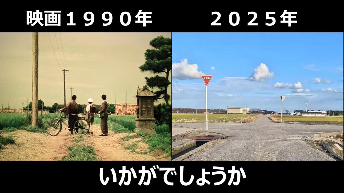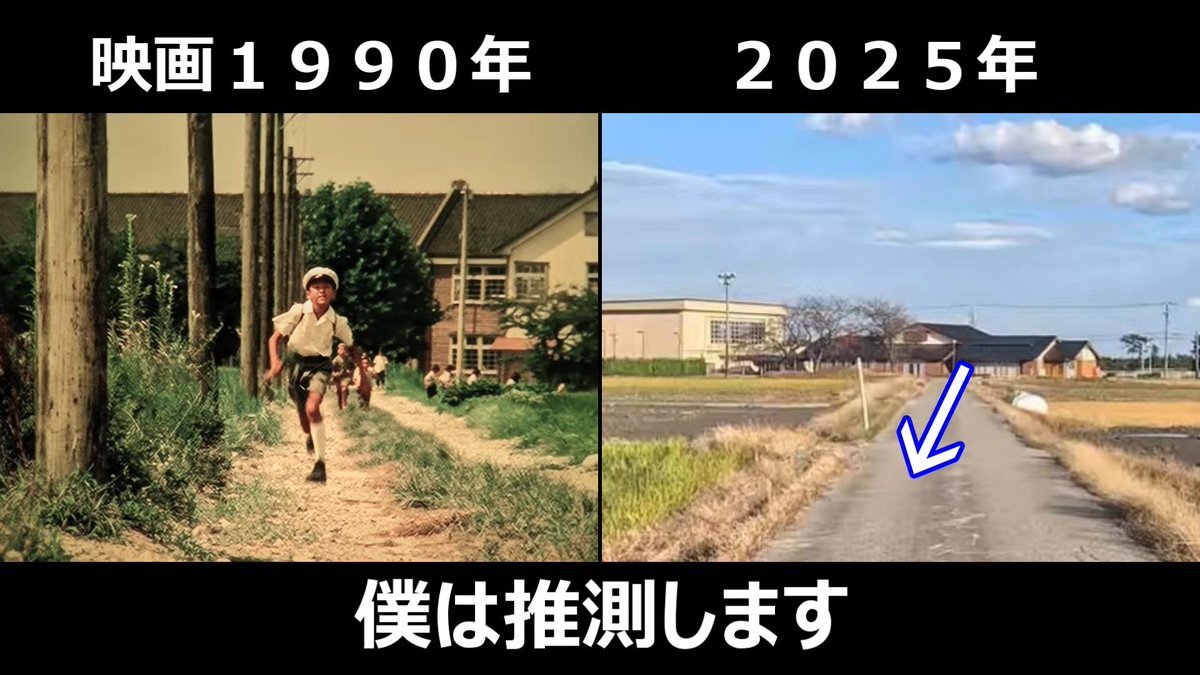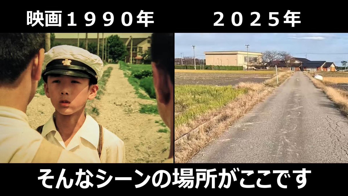#少年時代 #映画ロケ地 #篠田正浩監督 映画1990年➡現在 設定が1944年~1945年 映画でよく出てきた通学路の田んぼ道 ロケ地、富山県下新川郡入善町 背景の学校が当時の横山小学校(現在はない) pic.x.com/UGaBw8pqpn