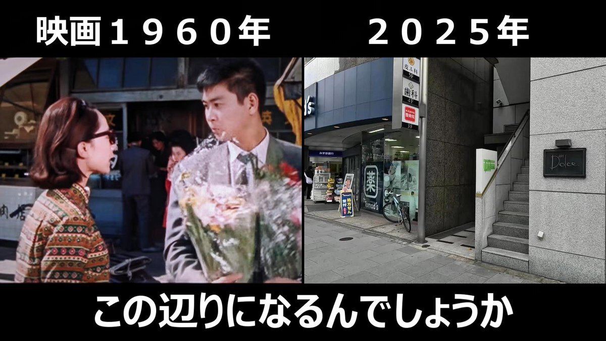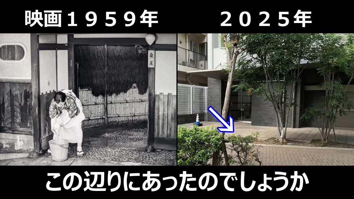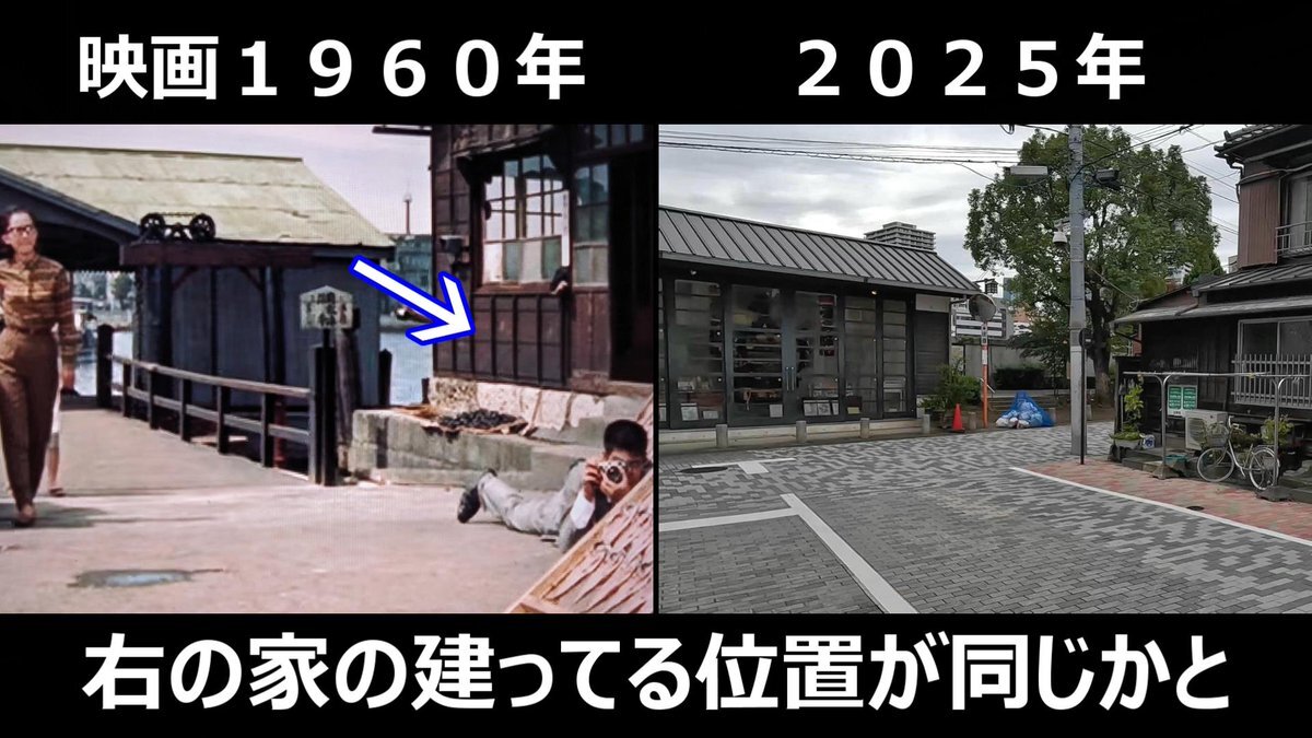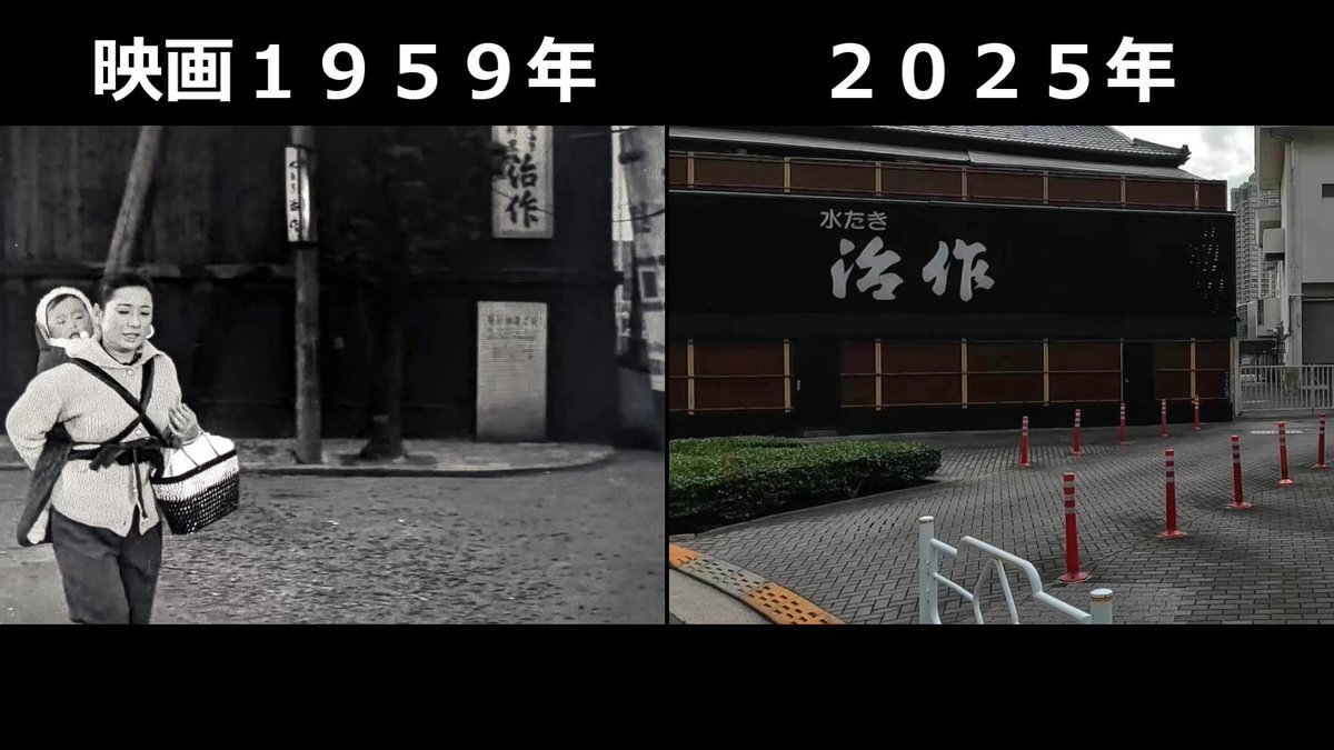 #おヤエのあんま天国 #映画ロケ地 映画1959年➡現在 東京都中央区明石町、明石橋があった場所 現在は痕跡なしも背後に見えてた高級料亭「築地治作」現存してる pic.x.com/xlEcGBEkpr
