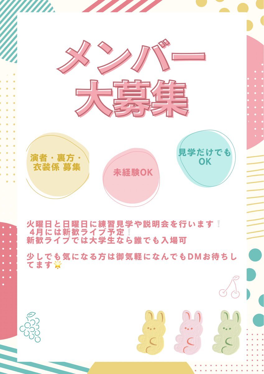 淡雪アプレミディ❄新メンバー募集しています❕ アイドルが好き!可愛いが好き!青春したい!大歓迎です🫶 🗓予定🗓 火曜・日曜に練習見学会開催(都合のつく日をDMにてお知らせください) 4月新歓ライブ開催予定🎤 夏大会や秋へ向けて全力で活動してくれるメンバー大募集中です❣️💃 #春から富大 pic.x.com/kb7Ng9DnPt x.com/tomidai_sinkan…