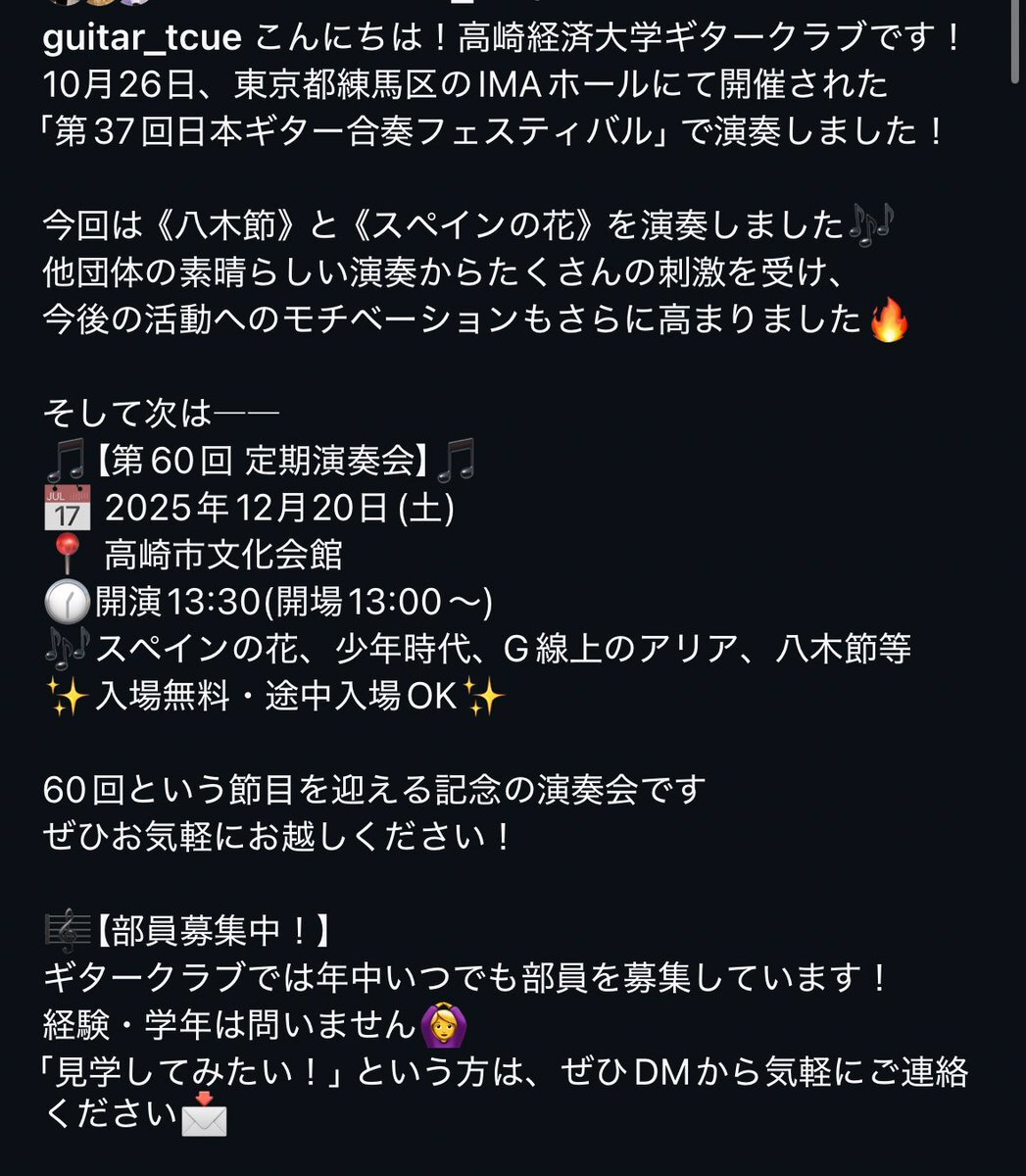 10月26日 第37回日本ギター合奏フェスティバル #クラシックギター #高崎経済大学 #春から高経 #春からtcue #春から高崎経済大学 #春から経大 #高崎経済大学ギタークラブ #春から大学生 #高崎 #高経 #夏合宿 pic.x.com/UsQ7rDrYoQ