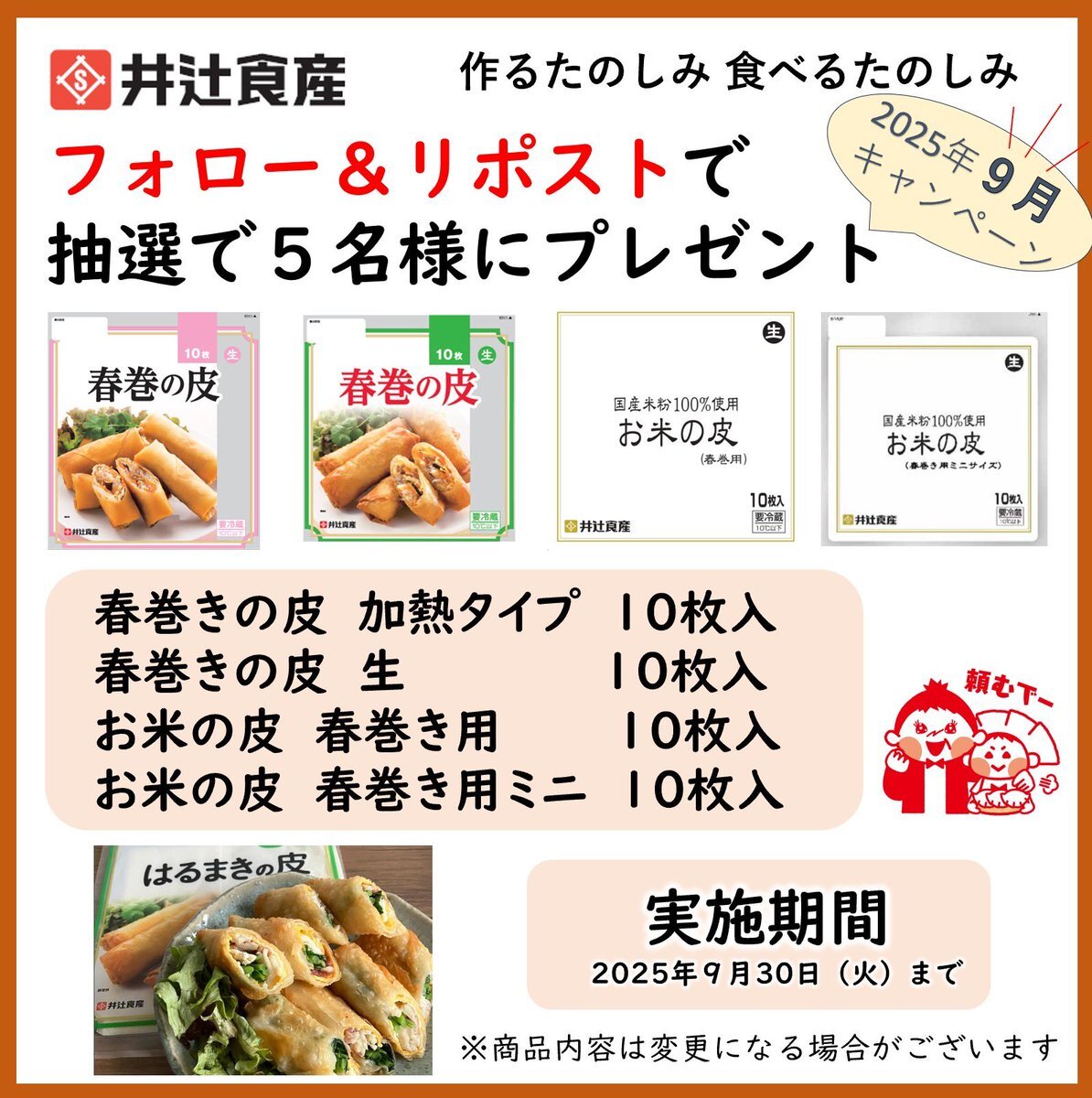 🥟餃子の皮の井辻食産🥟 秋も春巻きの皮であきまき🎁9月 春巻きの皮キャンペーン! 手作り春巻セット5名様にプレゼント! ☆応募方法 ①@itsujisyokusanをフォロー ②このポストをリポスト ☆締切9月30日(火) ☆当選した方にDMでお知らせ #井辻食産 #懸賞 #お米の皮 #あきまき #春巻きの皮 pic.x.com/opM3K0jlfZ